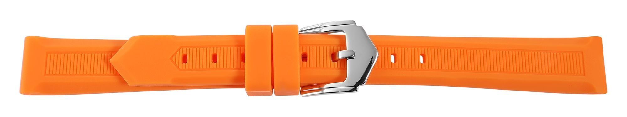 Das orangefarbene Uhrenarmband aus Silikon hat eine Anstoßbreite von 14 mm. Es hat eine glatte Oberfläche, die mittig mit feinen Querstreifen perforiert ist. Die Materialstärke beträgt 5 mm. Das Ersatzarmband hat eine Gesamtlänge von 20,5 cm. Das Silikonarmband lässt sich mit einer silberfarbenen Dornschließe aus Edelstahl öffnen und schließen. Der Schließenanstoß hat eine Breite von 12 mm. Das Silikonarmband bietet durch das weiche Material einen hohen Tragekomfort.