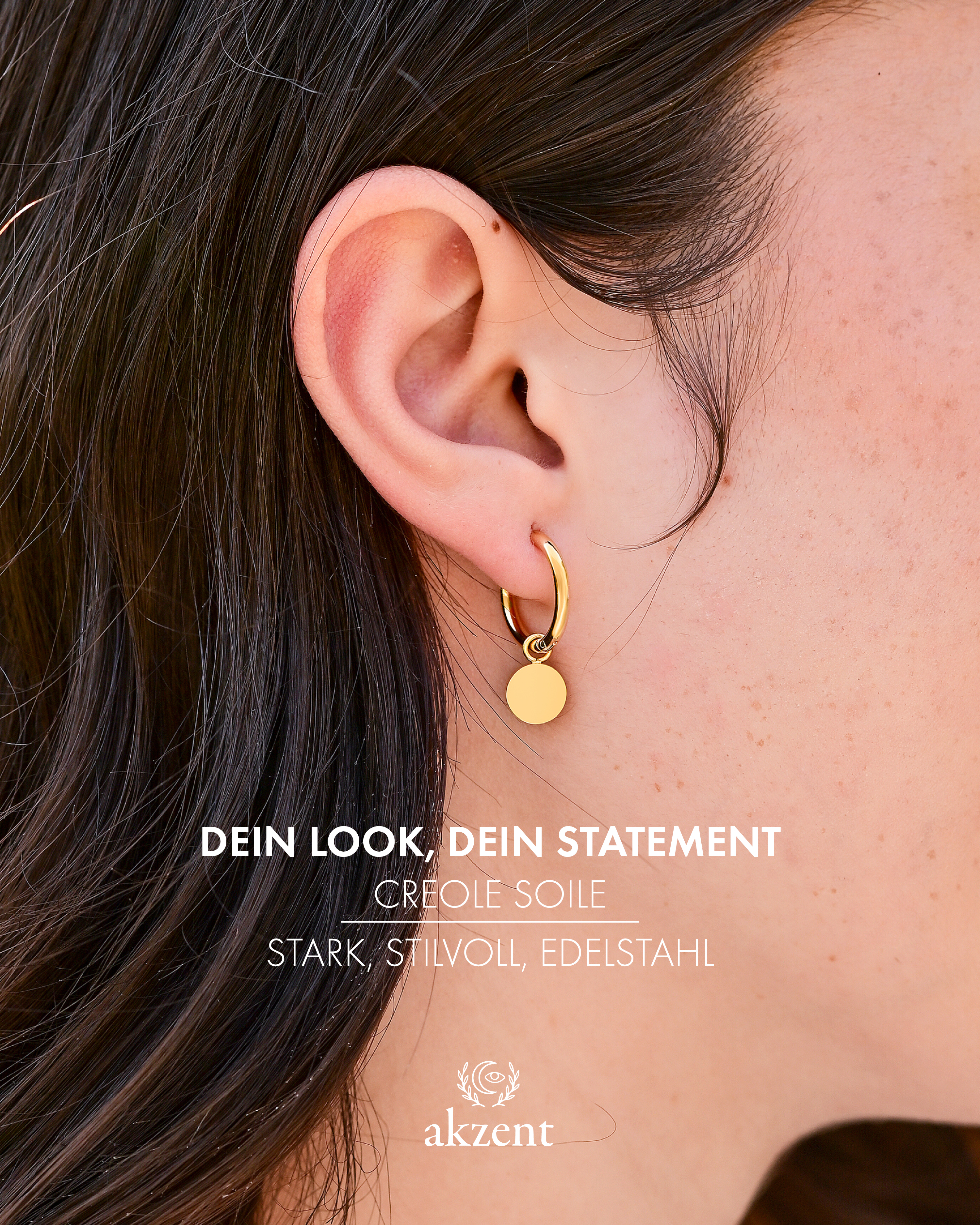 Das besondere Highlight - Der abnehmbare, runde Anhänger mit einem Durchmesser von 8 mm. So können Sie aus einer klassischen Basic-Creole einen auffälligen Hingucker machen. Der Anhänger kann zudem individuell graviert werden, was "Soile" zu einem persönlichen Schmuckstück macht.