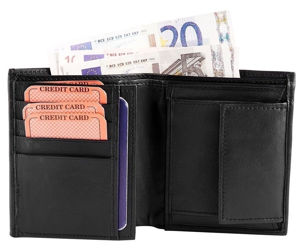 SteinMeister Herren Geldbörse aus Echtleder. Die Hochformat-Geldbörse ist 10 cm breit und 11 cm hoch. Die Farbe ist Schwarz. Sie verfügt über 2 Geldscheinfächer, ein Kleingeldfach, 9 Kreditkartenfächer, und ein transparentes Ausweisfach.
