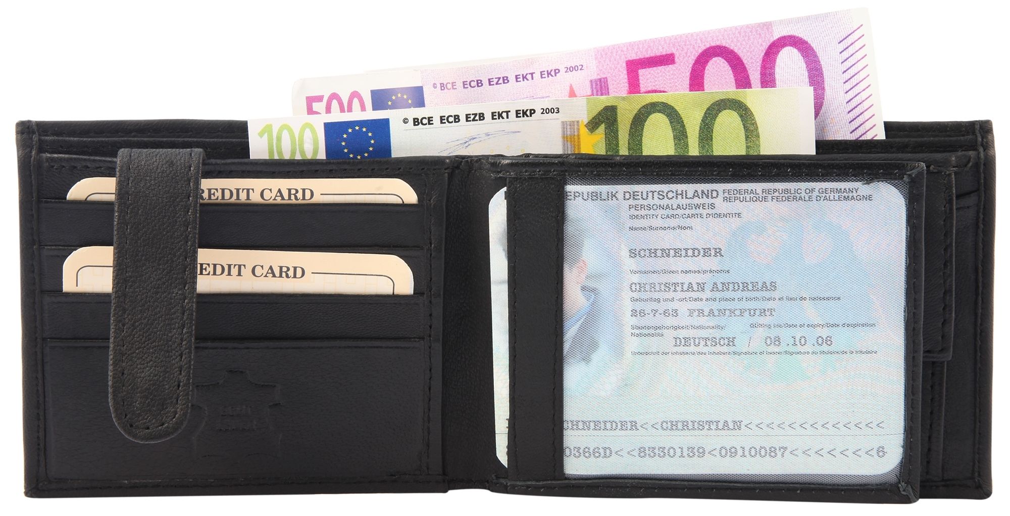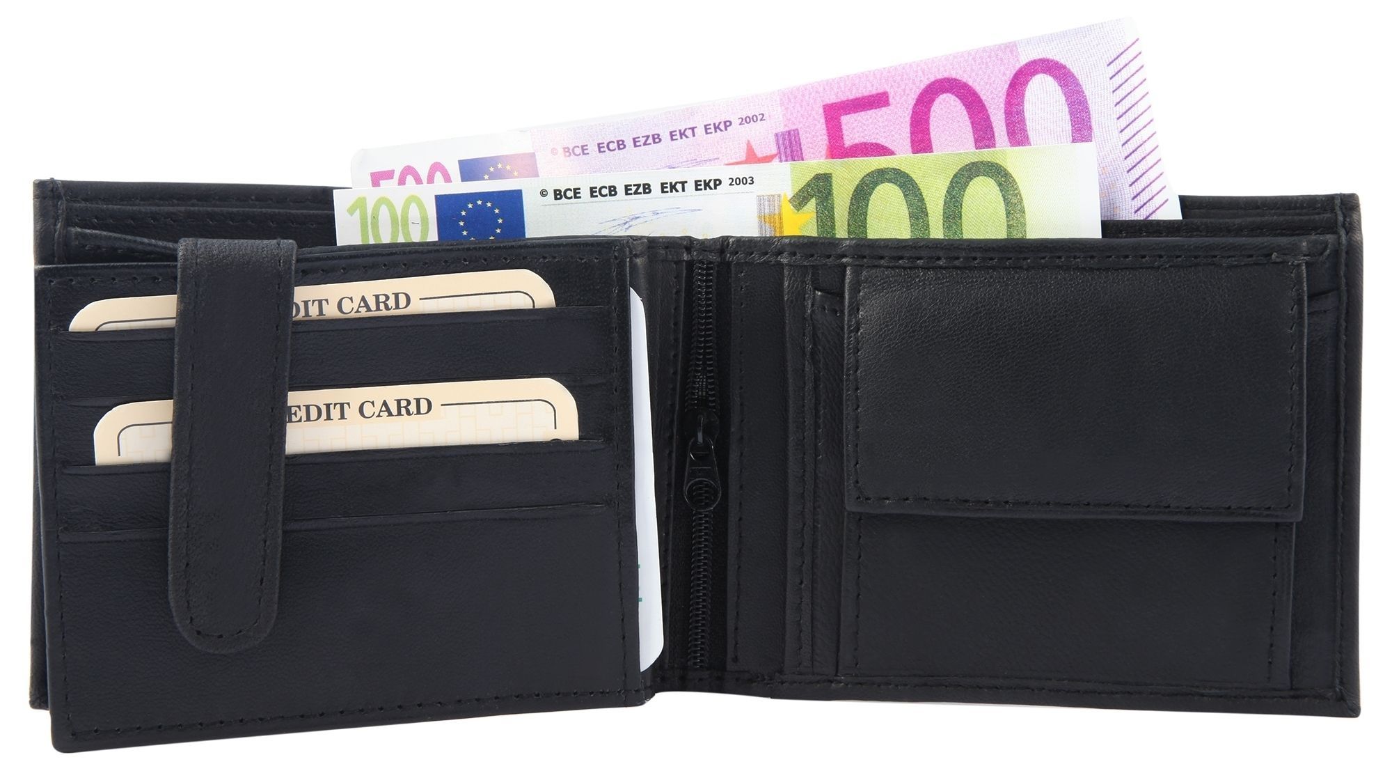 SteinMeister Herren Geldbörse aus Echtleder. Die Querformat-Geldbörse ist 12 cm breit und 9 cm hoch. Die Farbe ist Schwarz. Geschlossen wird die Echtleder-Geldbörse durch einen Druckknopfverschluss. Sie verfügt über 2 Geldscheinfächer, ein Kleingeldfach, 11 Kreditkartenfächer, und ein transparentes Ausweisfach.