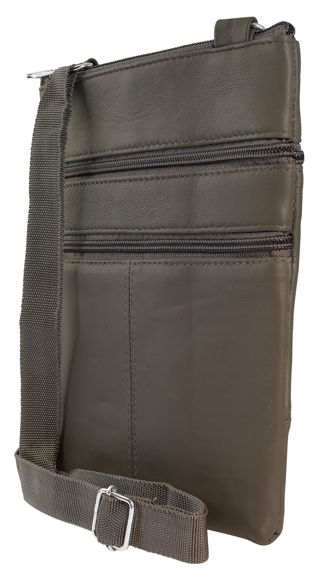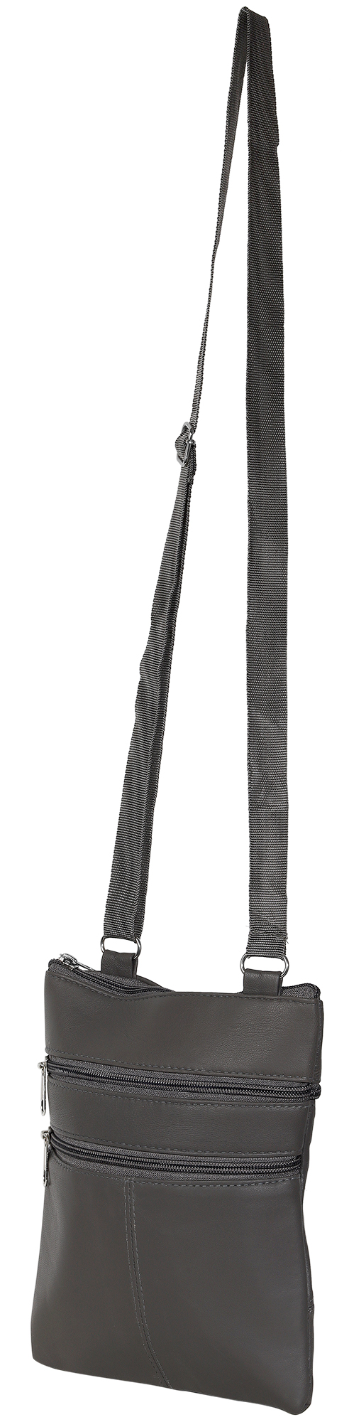 Die dunkelgraue Damenhandtasche der Marke Steinmeister ist aus Echtleder gefertigt und hat eine glatte Oberfläche. Die Tasche hat einen langen dunkelgrauen Tragehenkel, der auf eine maximale Länge von 130 cm verlängert werden kann. Der Tragehenkel ist beidseitig mit 2 Metallösen an der Tasche befestigt. Mit einem Reißverschluss lässt sich das mittlere Hauptfach der Tasche öffnen und schließen. Auf der Vorderseite der Handtasche befinden sich zudem zwei Außenfächer, die ebenfalls über einen Reißverschluss bedient werden können. Auf der Rückseite des modischen Accessoires befindet sich zusätzlich ein großes Außenfach, das sich auch über einen Reißverschluss öffnen und schließen lässt. Alle Reißverschlüsse sind ebenfalls grau. Die Maße der Handtasche ergeben sich aus einer Länge von 23 cm, eine Breite von 18 cm und eine Tiefe von 1,5 cm. Eine modische Handtasche, die aufgrund ihrer relativ kleinen Größe super praktisch ist.