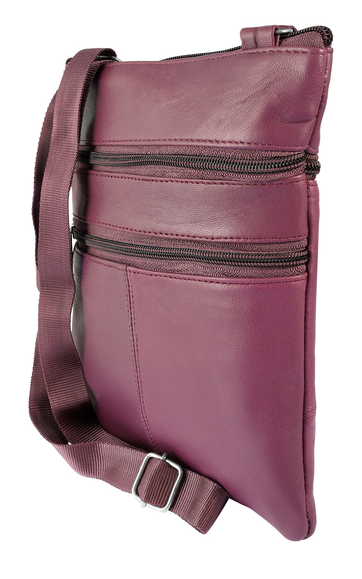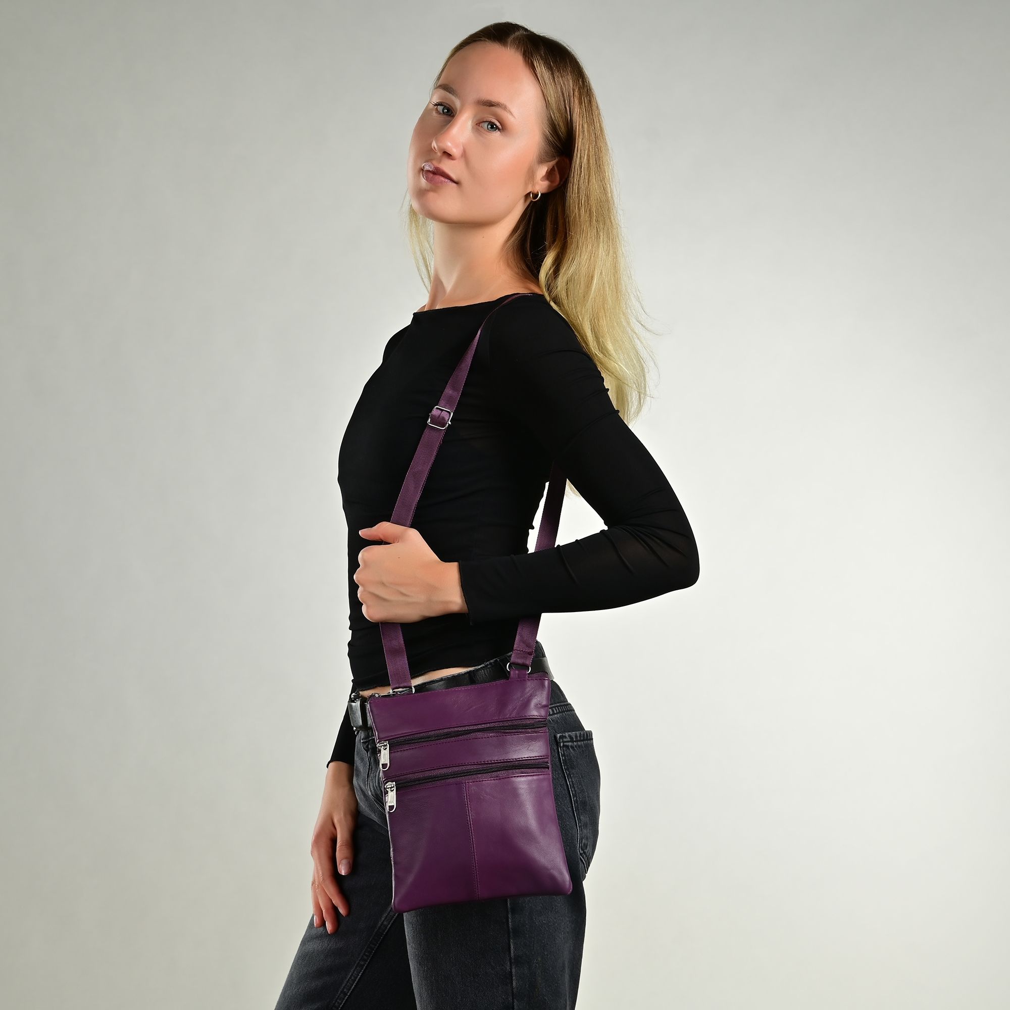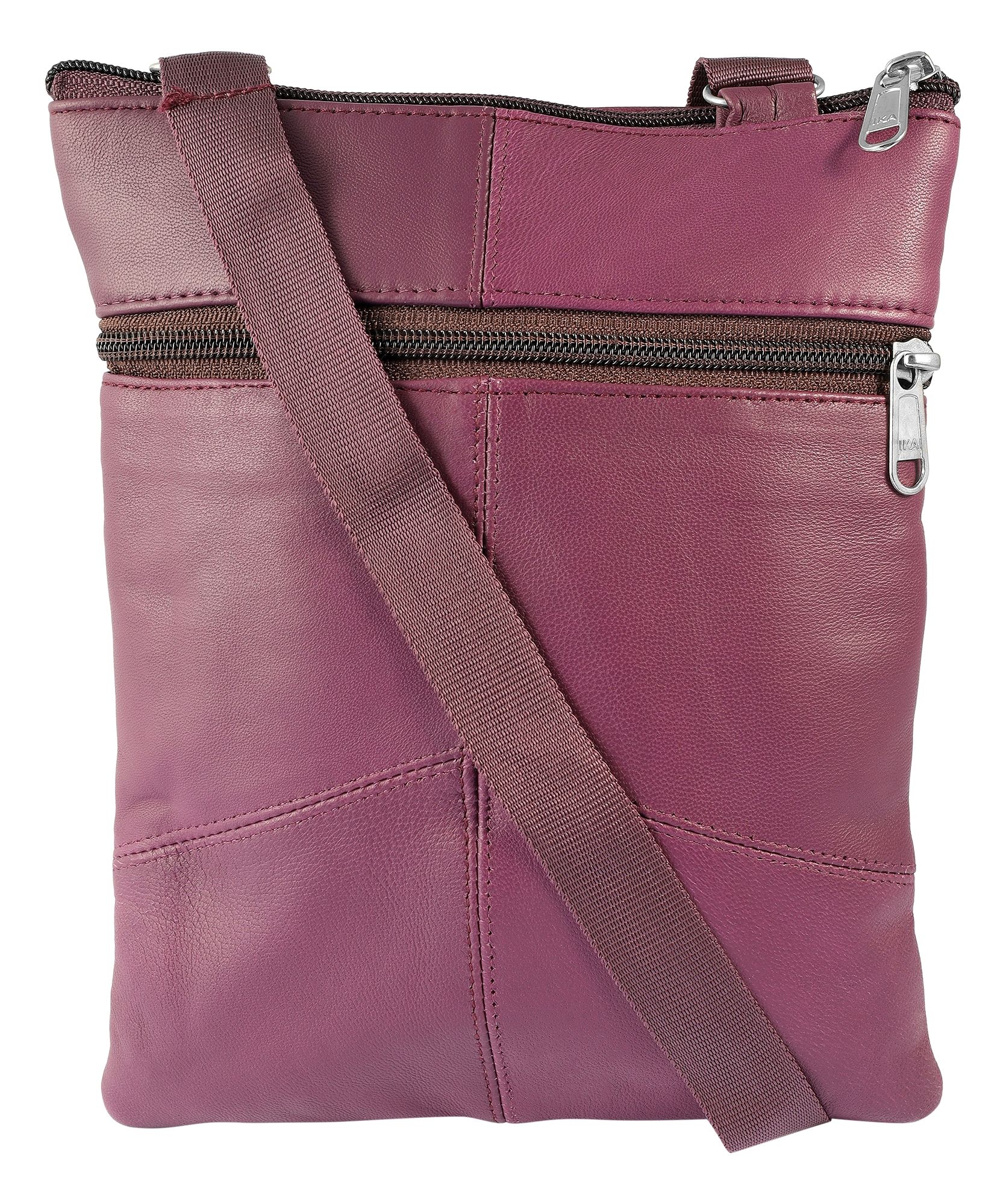 Die dunkellilafarbene Damenhandtasche der Marke Steinmeister ist aus Echtleder gefertigt und hat eine glatte Oberfläche. Die Tasche hat einen langen dunkellilafarbenen Tragehenkel, der auf eine maximale Länge von 130 cm verlängert werden kann. Der Tragehenkel ist beidseitig mit 2 Metallösen an der Tasche befestigt. Mit einem Reißverschluss lässt sich das mittlere Hauptfach der Tasche öffnen und schließen. Auf der Vorderseite der Handtasche befinden sich zudem zwei Außenfächer, die ebenfalls über einen Reißverschluss bedient werden können. Auf der Rückseite des modischen Accessoires befindet sich zusätzlich ein großes Außenfach, das sich auch über einen Reißverschluss öffnen und schließen lässt. Alle Reißverschlüsse sind ebenfalls dunkellila. Die Maße der Handtasche ergeben sich aus einer Länge von 23 cm, eine Breite von 18 cm und eine Tiefe von 1,5 cm. Eine modische Handtasche, die aufgrund ihrer relativ kleinen Größe super praktisch ist.