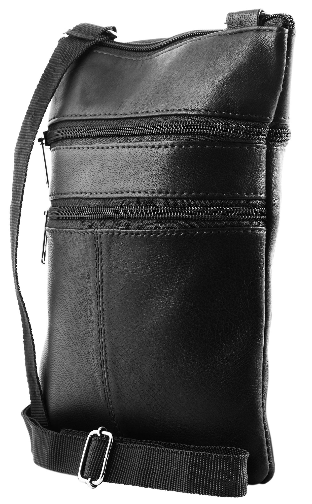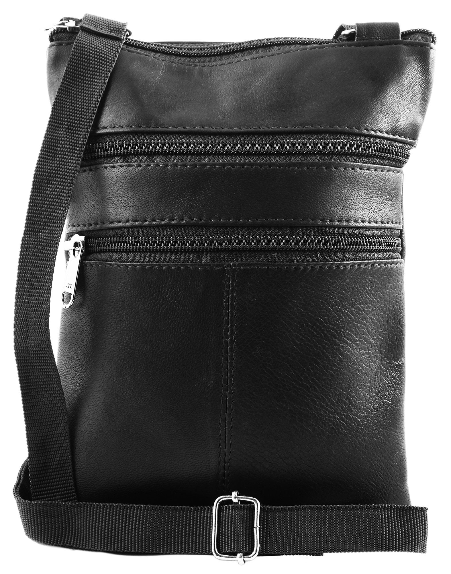 Die schwarze Damenhandtasche der Marke Steinmeister ist aus Echtleder gefertigt und hat eine glatte Oberfläche. Die Tasche hat einen langen schwarzen Tragehenkel, der auf eine maximale Länge von 130 cm verlängert werden kann. Der Tragehenkel ist beidseitig mit 2 Metallösen an der Tasche befestigt. Mit einem schwarzen Reißverschluss lässt sich das mittlere Hauptfach der Tasche öffnen und schließen. Auf der Vorderseite der Handtasche befinden sich zudem zwei Außenfächer, die ebenfalls über einen schwarzen Reißverschluss bedient werden können. Auf der Rückseite des modischen Accessoires befindet sich zusätzlich ein großes Außenfach, das sich auch über einen schwarzen Reißverschluss öffnen und schließen lässt. Die Maße der Handtasche ergeben sich aus einer Länge von 23 cm, eine Breite von 18 cm und eine Tiefe von 1,5 cm. Eine modische Handtasche, die aufgrund ihrer relativ kleinen Größe super praktisch ist.