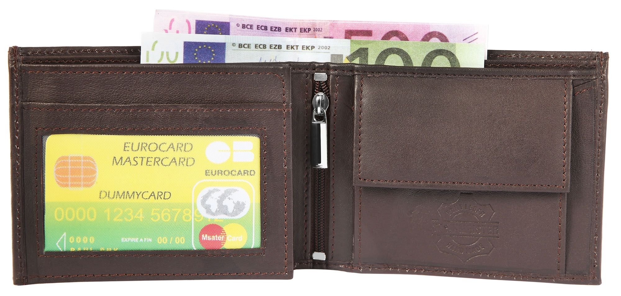 Die braune Geldbörse im Querformat der Marke Steinmeister wurde aus echtem Schafsleder gefertigt und hat eine glatte Oberfläche. Das Innenfutter besteht ebenfalls aus Echtleder. Die braune Naht, im inneren und äußeren der Börse sorgt für Stabilität und Halt. Die Geldbörse ist ein wahres Platzwunder und bietet viel Stauraum für alle wichtigen Dokumente. Aufgeteilt ist die Börse in drei Kreditkartenfächer, ein transparentes Kreditkartenfach, zwei Geldscheinfächer, ein Münzfach mit einem kleinem eingenähten Fach für einen Einkaufschip, drei Einsteckfächer, ein transparentes Ausweisfach und ein Reißverschlussfach. Die Maße der Geldbörse ergeben sich aus einer Länge von 9,3 cm, einer Breite von 12,1 cm und einer Höhe von 1,4 cm.