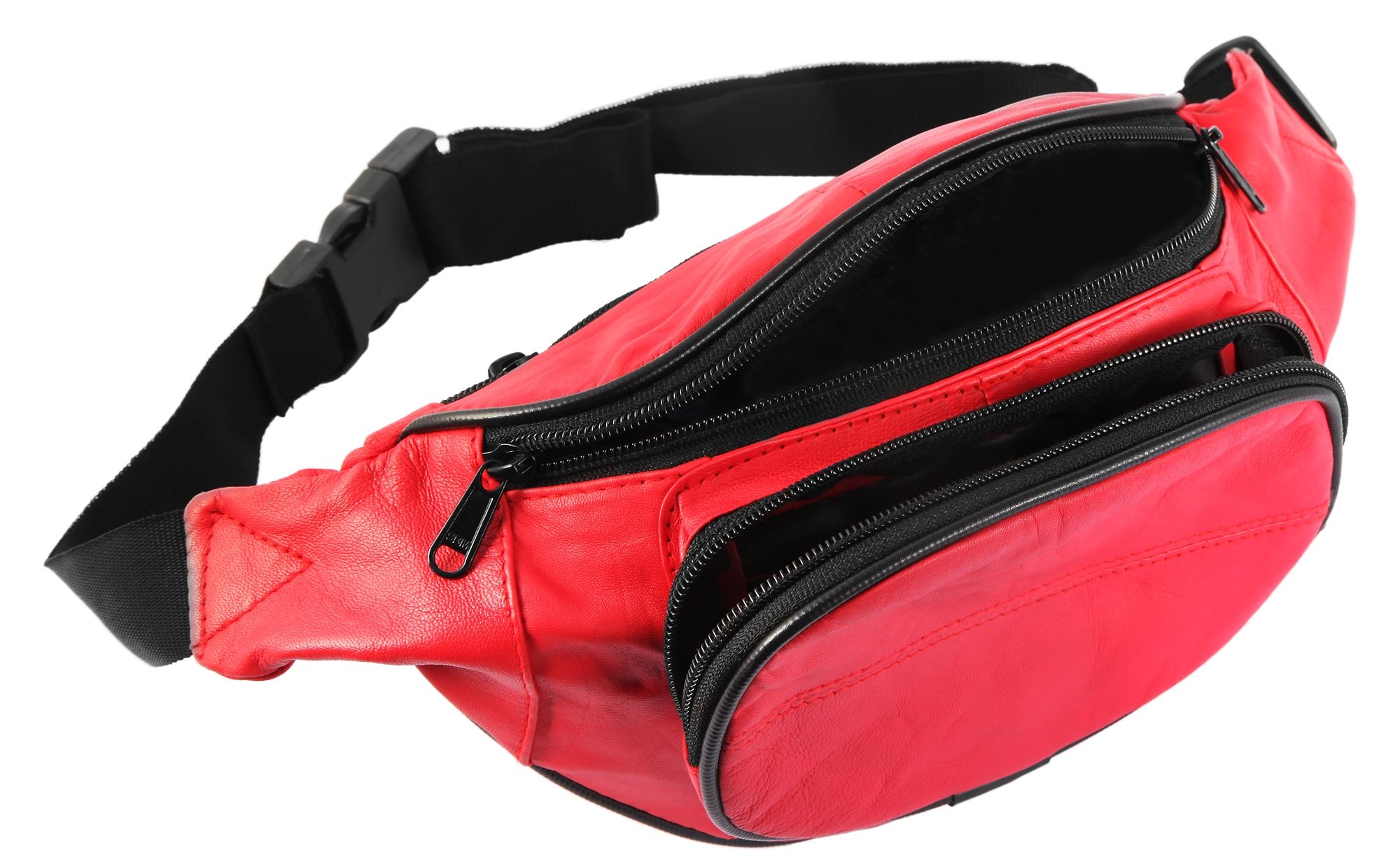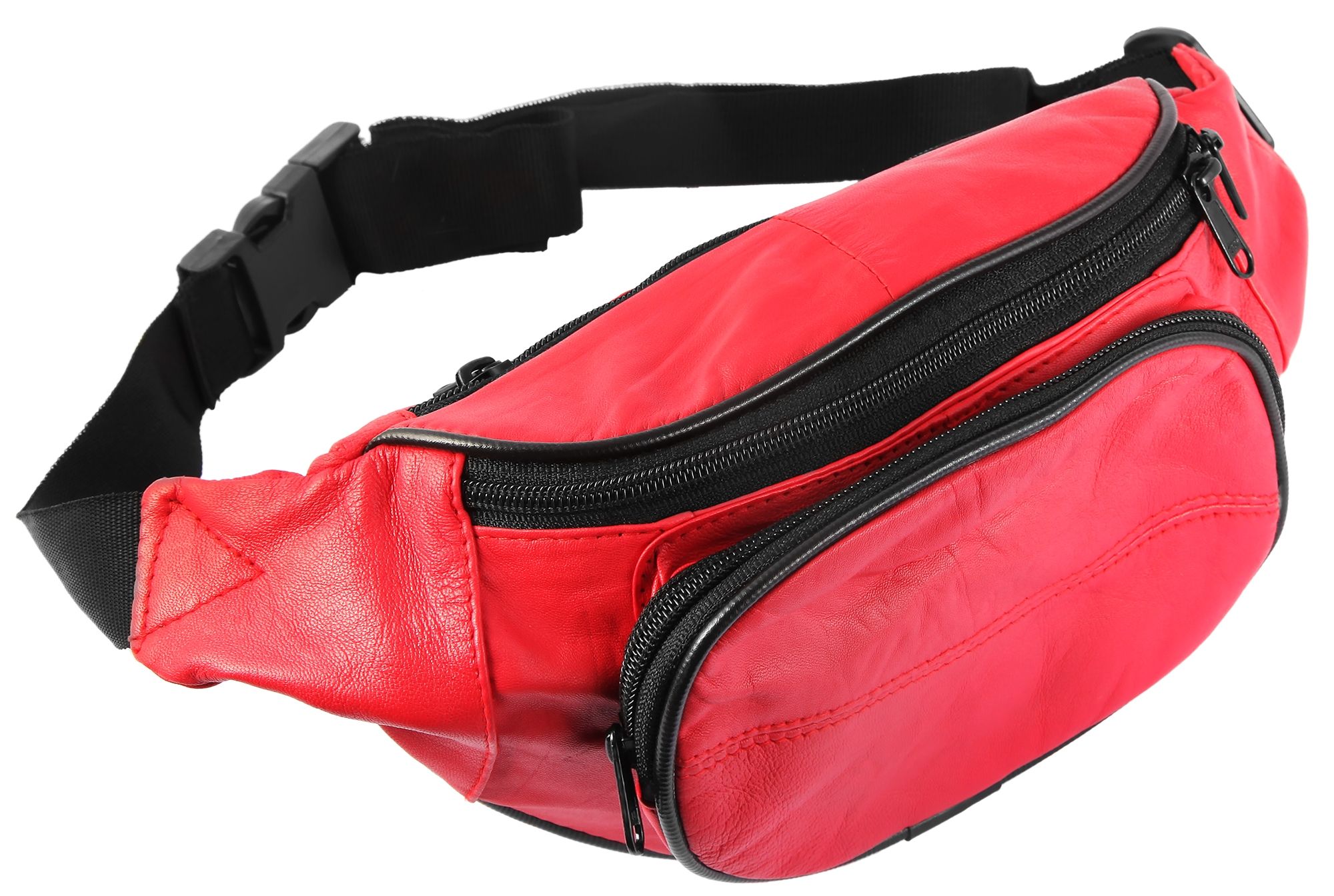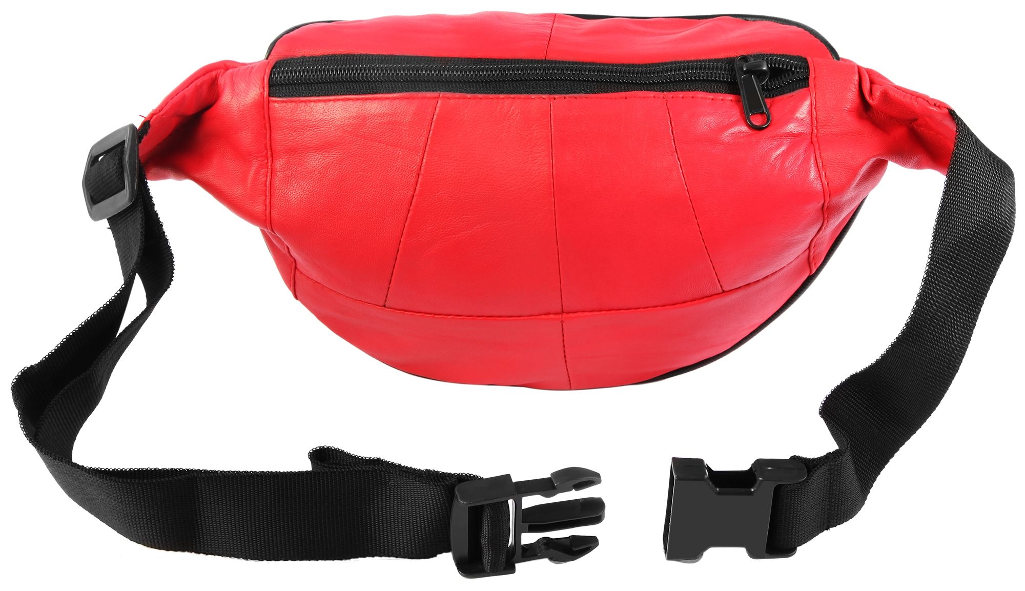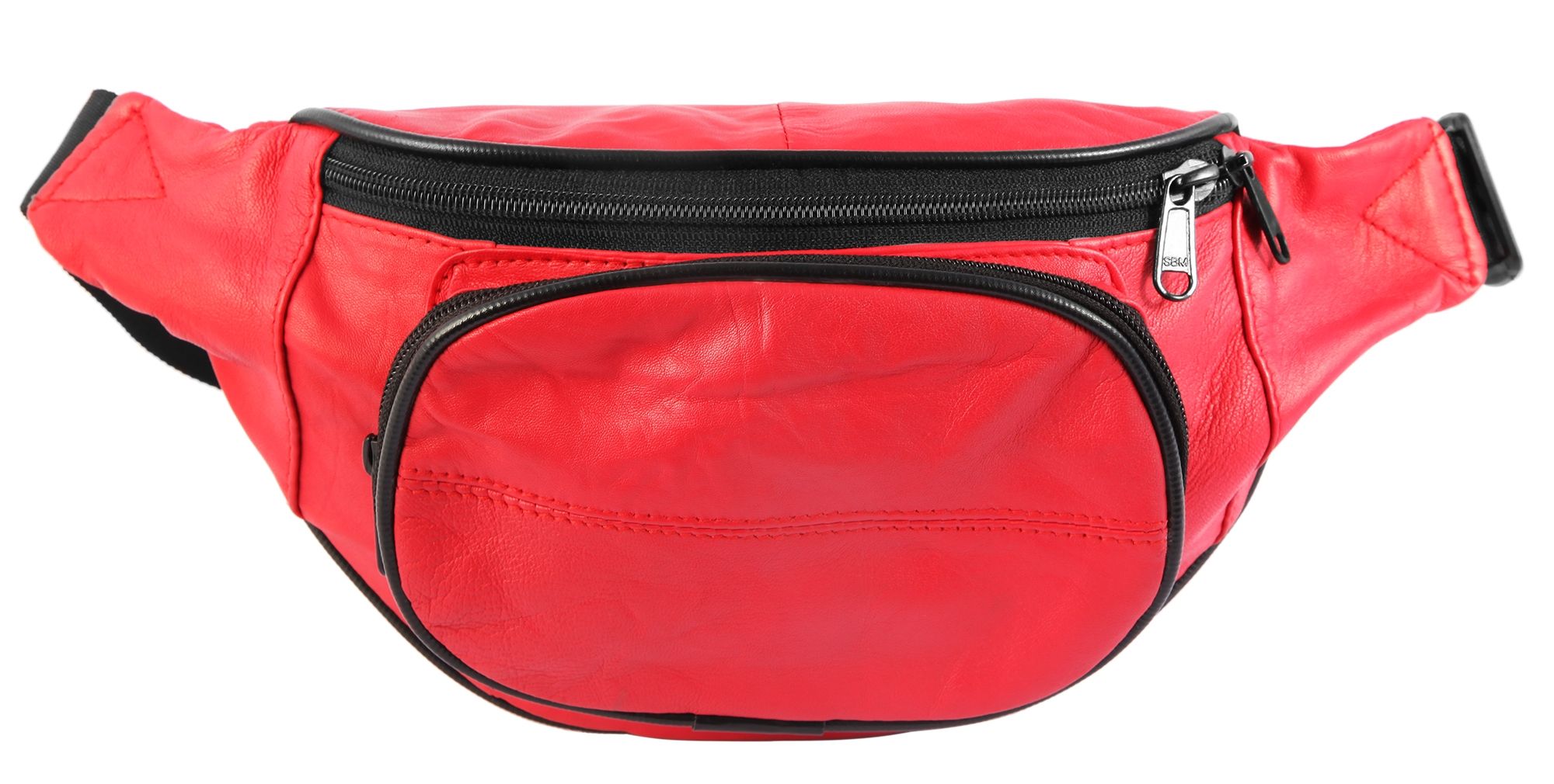 Die modische Hüfttasche der Marke Steinmeister ist aus rotem Echtleder gefertigt und hat eine glatte Oberfläche. Sie lässt sich mit einem schwarzen stabilen Bauchgurt aus Polyester bequem um die Hüfte legen und mit einem schwarzen Steckverschluss aus Kunststoff öffnen und schließen. Der Gurt ist 3 cm breit und lässt sich auf eine minimale Länge von 60 cm und eine maximale Länge von 100 cm einstellen. Die Hüfttasche verfügt über drei große Fächer, die sich alle mit einem schwarzen Reißverschluss öffnen lassen. Das mittlere Hauptfach lässt sich mit einem doppelten Reiter beidseitig bedienen. Das zweite vordere Fach ist etwas tiefer angeordnet, oval und etwas kleiner als das Hauptfach. Das dritte Fach befindet sich auf der Rückseite und bietet genug Platz für Wertgegenstände, die beim Tragen direkt am Körper liegen. Die Maße der modischen Hüfttasche ergeben sich aus einer Länge von 17 cm, einer Breite von 33 cm und eine Tiefe von 3 cm.