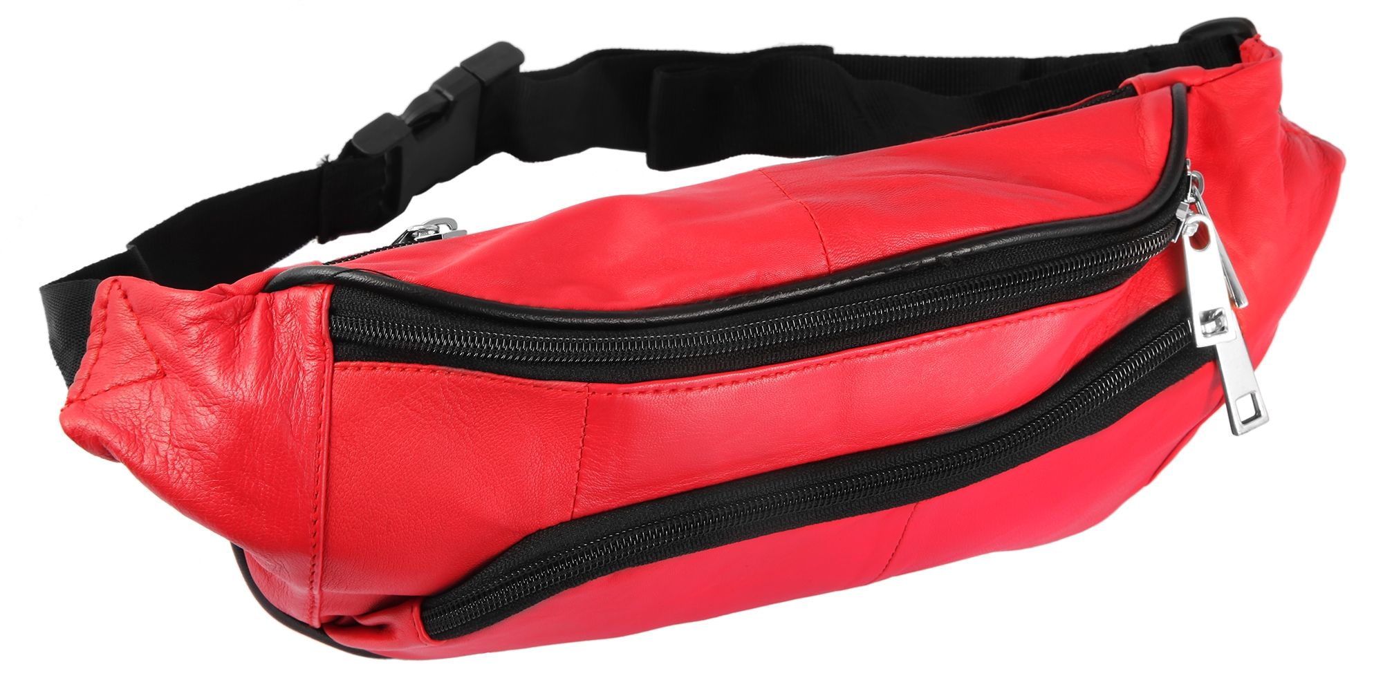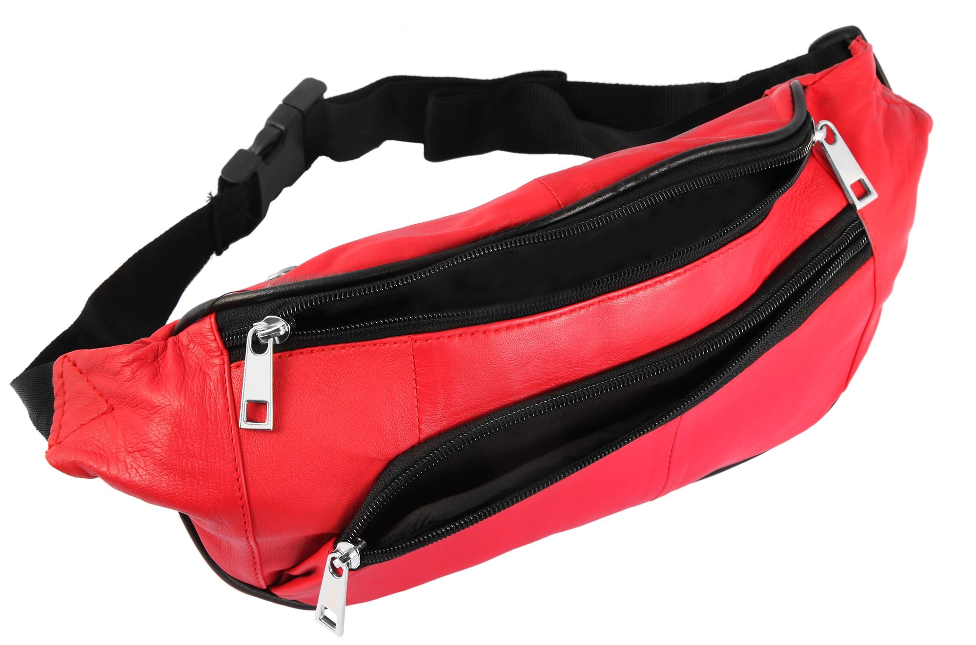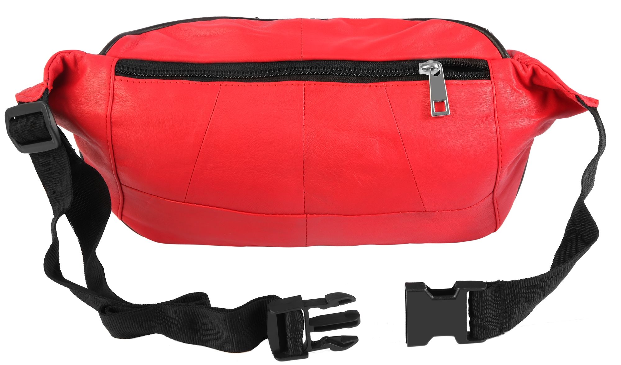Die modische Hüfttasche der Marke Steinmeister ist aus rotem Echtleder gefertigt und hat eine glatte Oberfläche. Sie lässt sich mit einem schwarzen stabilen Bauchgurt aus Polyester bequem um die Hüfte legen und mit einem schwarzen Steckverschluss aus Kunststoff öffnen und schließen. Der Gurt ist 3 cm breit und lässt sich auf eine minimale Länge von 60 cm und eine maximale Länge von 100 cm einstellen. Die Hüfttasche verfügt über drei große Fächer, die sich alle mit einem Reißverschluss öffnen lassen. Das mittlere Hauptfach lässt sich mit einem doppelten Reiter beidseitig bedienen. Das zweite vordere Fach ist etwas tiefer angeordnet und verläuft leicht schräg nach unten. Das dritte Fach befindet sich auf der Rückseite und bietet genug Platz für Wertgegenstände, die beim Tragen direkt am Körper liegen. Die Maße der modischen Hüfttasche ergeben sich aus einer Länge von 17 cm, einer Breite von 37 cm und eine Tiefe von 1,5 cm.
