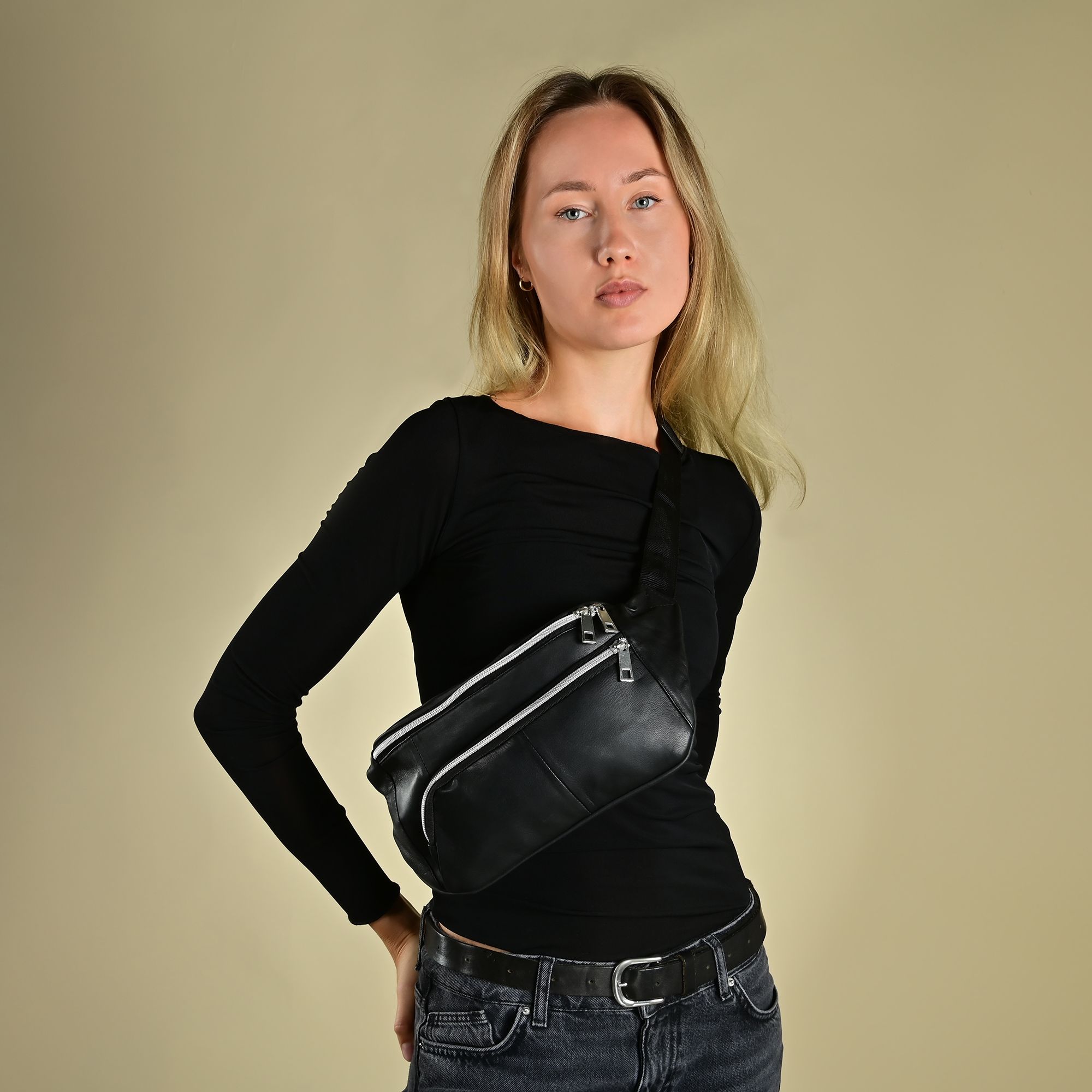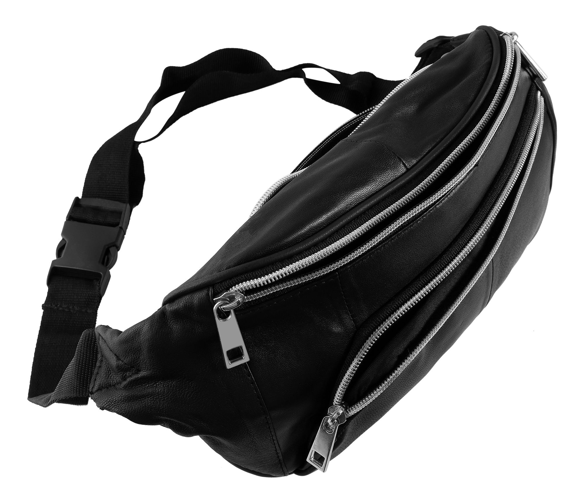 Die modische Hüfttasche der Marke Steinmeister ist aus schwarzem Echtleder gefertigt und hat eine glatte Oberfläche. Sie lässt sich mit einem schwarzen stabilen Bauchgurt aus Polyester bequem um die Hüfte legen und mit einem schwarzen Steckverschluss aus Kunststoff öffnen und schließen. Der Gurt ist 3 cm breit und lässt sich auf eine minimale Länge von 60 cm und eine maximale Länge von 100 cm einstellen. Die Hüfttasche verfügt über drei große Fächer, die sich alle mit einem Reißverschluss öffnen lassen. Das mittlere Hauptfach lässt sich mit einem doppelten Reiter beidseitig bedienen. Das zweite vordere Fach ist etwas tiefer angeordnet und verläuft leicht schräg nach unten. Das dritte Fach befindet sich auf der Rückseite und bietet genug Platz für Wertgegenstände, die beim Tragen direkt am Körper liegen. Die Maße der modischen Hüfttasche ergeben sich aus einer Länge von 17 cm, einer Breite von 37 cm und eine Tiefe von 1,5 cm.