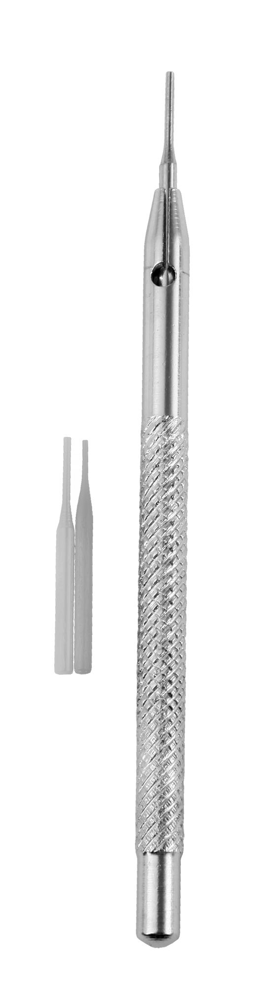 Der Stiftausschläger ermöglicht das sichere Entfernen von Stiften und Splinten aus Uhrenarmbändern. Durch ein einfaches Stecksystem lassen sich die Spitzen des Stiftausschlägers ganz einfach auswechseln. Einer hat eine Stärke von 1 mm und zwei eine Stärke von 0,8 mm. So ist es möglich, Stifte in verschiedenen Stärken sicher aus Uhrenarmbändern oder Schmuckteilen zu entfernen. Die Maße des Ausschlägers ergeben sich aus einer Länge von 8 cm und einer Stärke von 0,5 cm. Die Spitzen sind jeweils 2,5 cm lang.