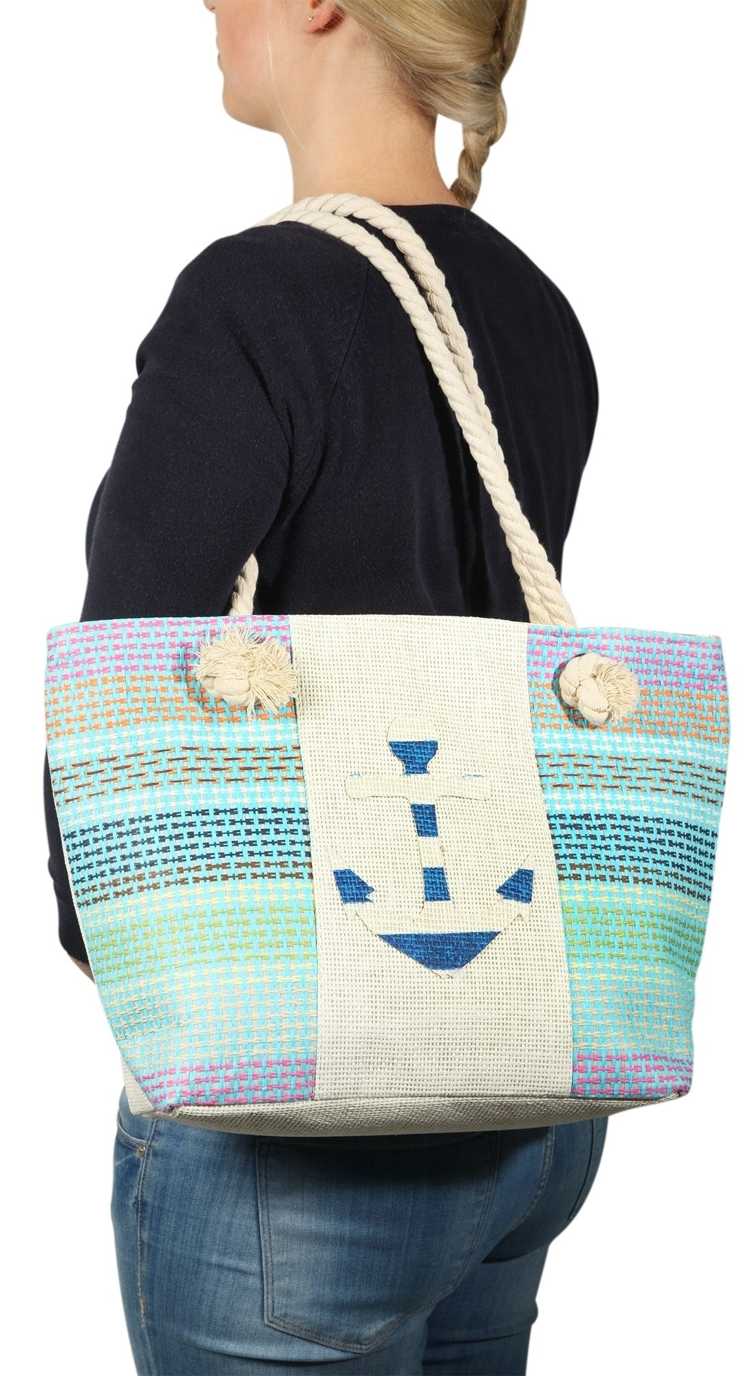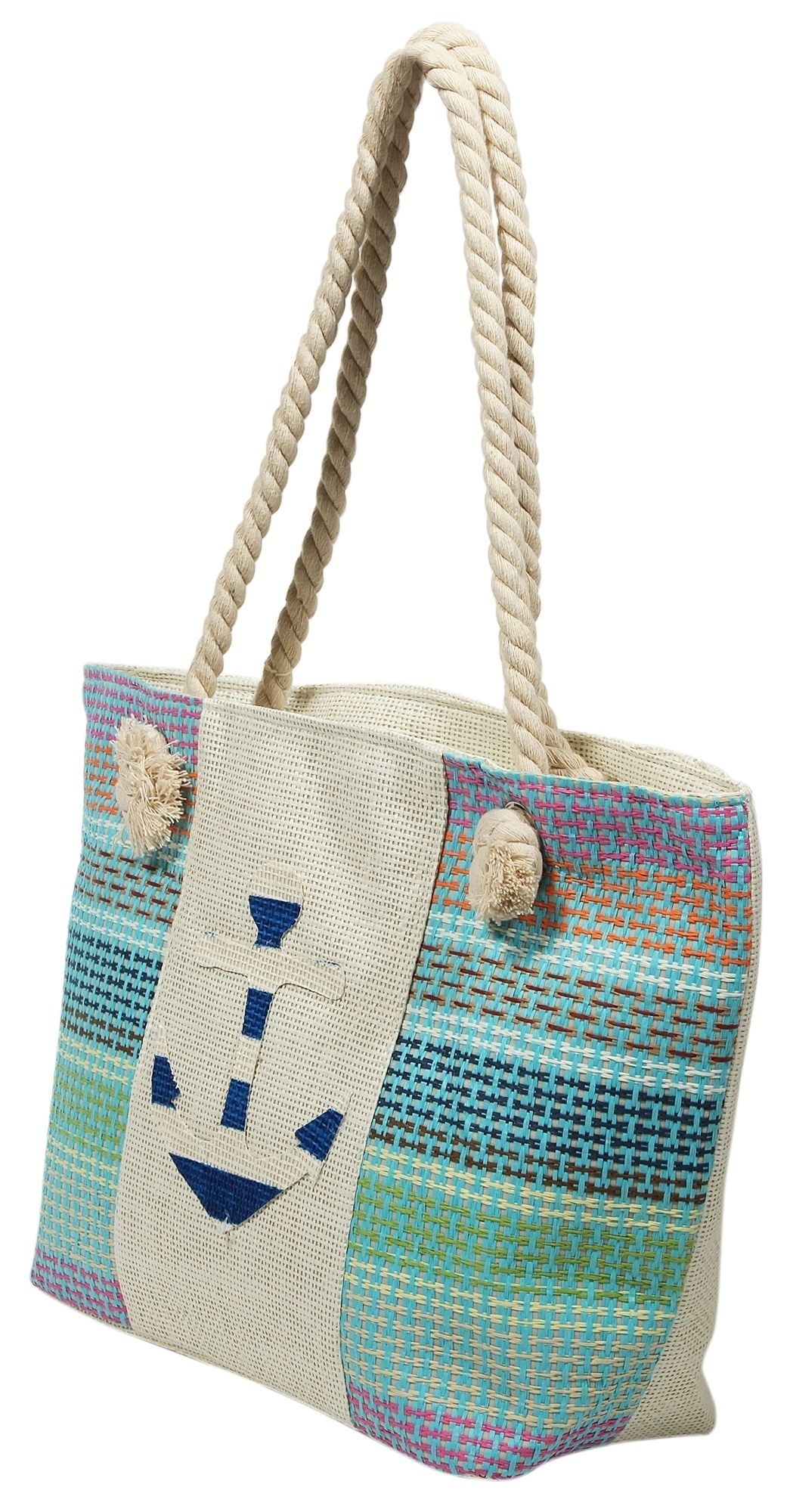 Die maritime Strandtasche mit Kordelhenkeln wurde aus Bastfaser hergestellt und ist mit einem Ankermotiv und schönen Farbkombinationen geschmückt. Die Sommertasche bietet geräumigen Stauraum und hat ein großen Innenfach, in dem alle wichtigen Sachen verstaut und mit einem Reißverschluss gesichert werden können. Zudem ist im Inneren ein weiteres Handyfach. Sie ist der perfekte Begleiter für einen Tag am Strand, aber auch für andere Freizeitaktivitäten. Die Maße der Tasche ergeben sich aus einer Länge von 30 cm, einer Breite von 44 cm und einer Stärke von 1,0 cm im ungefüllten Zustand.