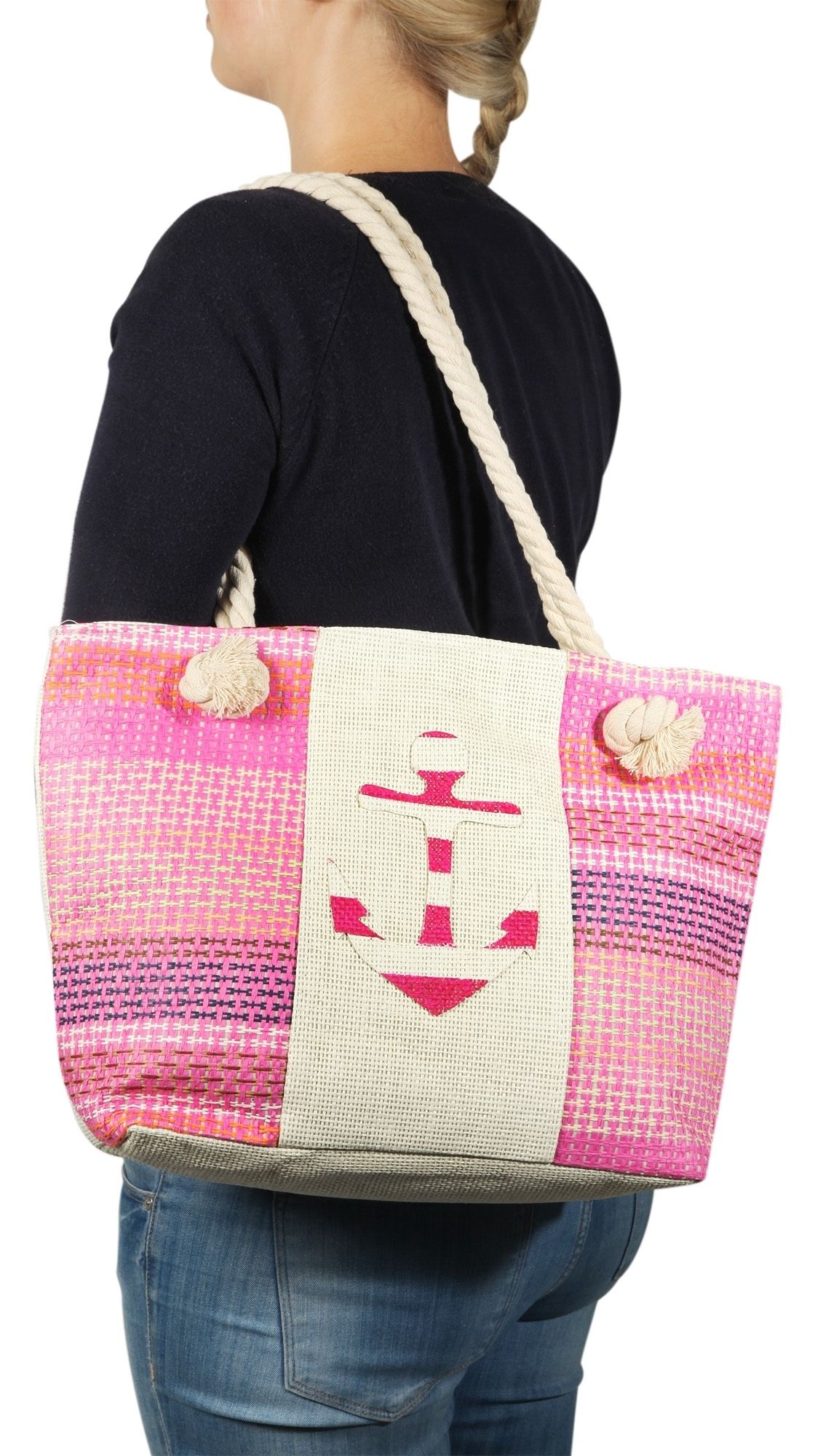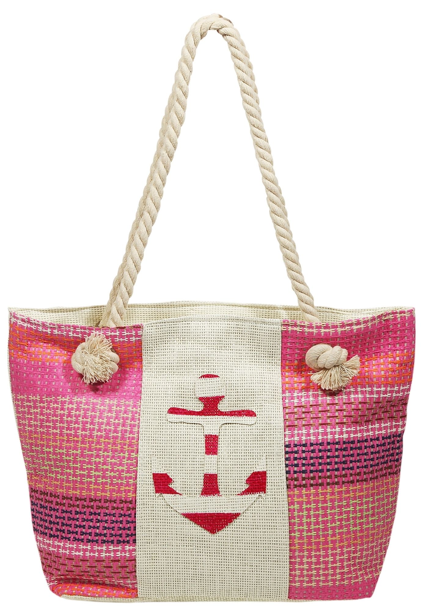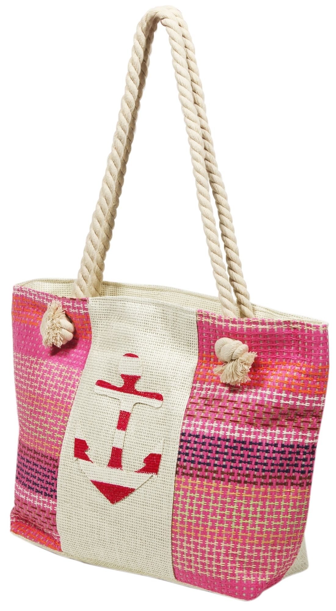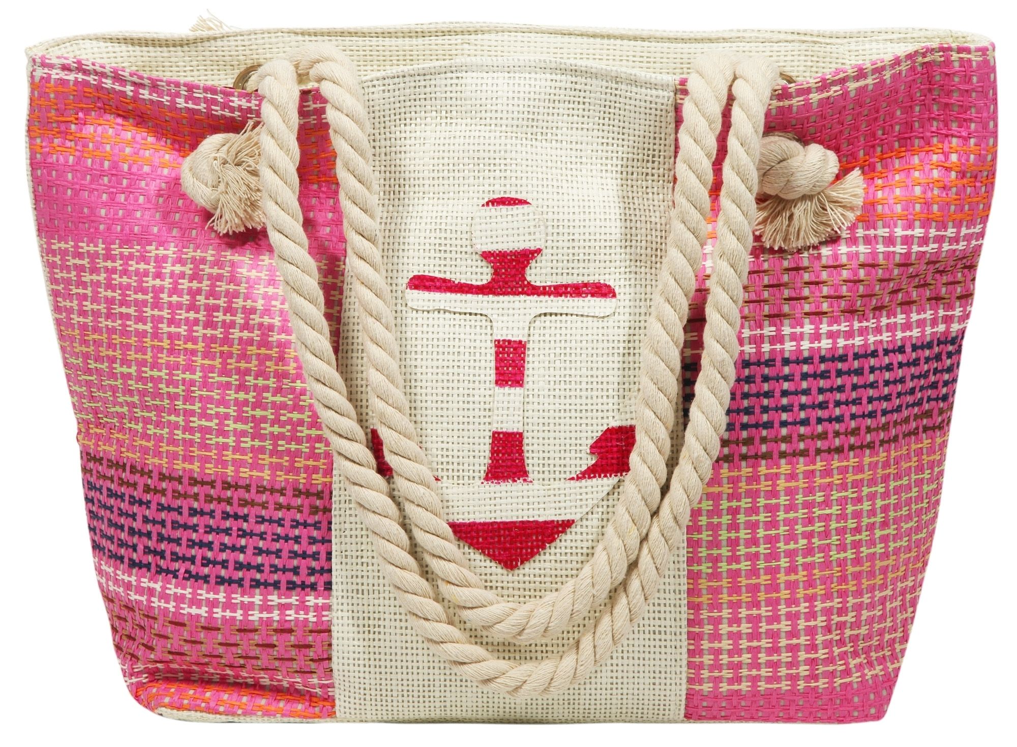 Die maritime Strandtasche mit Kordelhenkeln wurde aus Bastfaser hergestellt und ist mit einem Ankermotiv und schönen Farbkombinationen geschmückt. Die Sommertasche bietet geräumigen Stauraum und hat ein großen Innenfach, in dem alle wichtigen Sachen verstaut und mit einem Reißverschluss gesichert werden können. Zudem ist im Inneren ein weiteres Handyfach. Sie ist der perfekte Begleiter für einen Tag am Strand, aber auch für andere Freizeitaktivitäten. Die Maße der Tasche ergeben sich aus einer Länge von 30 cm, einer Breite von 44 cm und einer Stärke von 1,0 cm im ungefüllten Zustand.