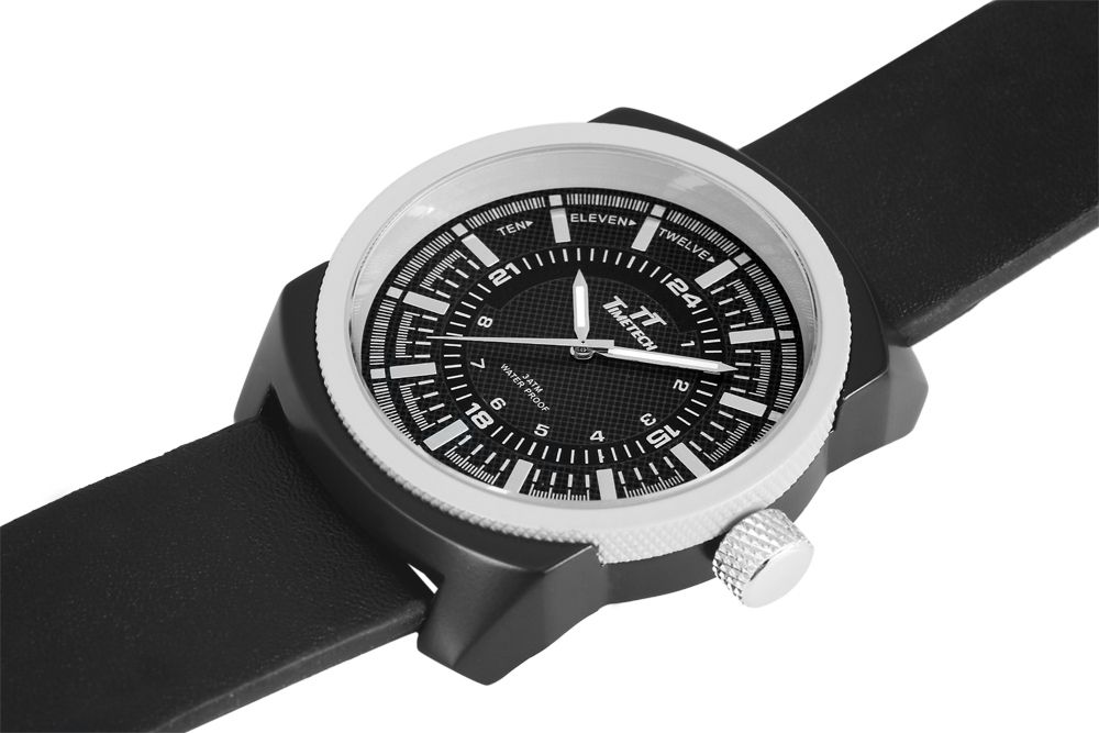 Die Analog Herrenuhr der Marke TimeTech verfügt über ein Hochwertiges Quarzwerk. Das Lederimitatband ist 26 mm breit und wird mit einer Dornschließe geöffnet. Die Gesamtlänge beträgt 24 cm. Das Metallgehäuse mit Mineralglas hat eine Abmessung von 47 mm und 13 mm Gehäusehöhe. Der Gehäusedeckel ist aus Edelstahl gefertigt. Die Uhr ist 3 ATM druckgeprüft.