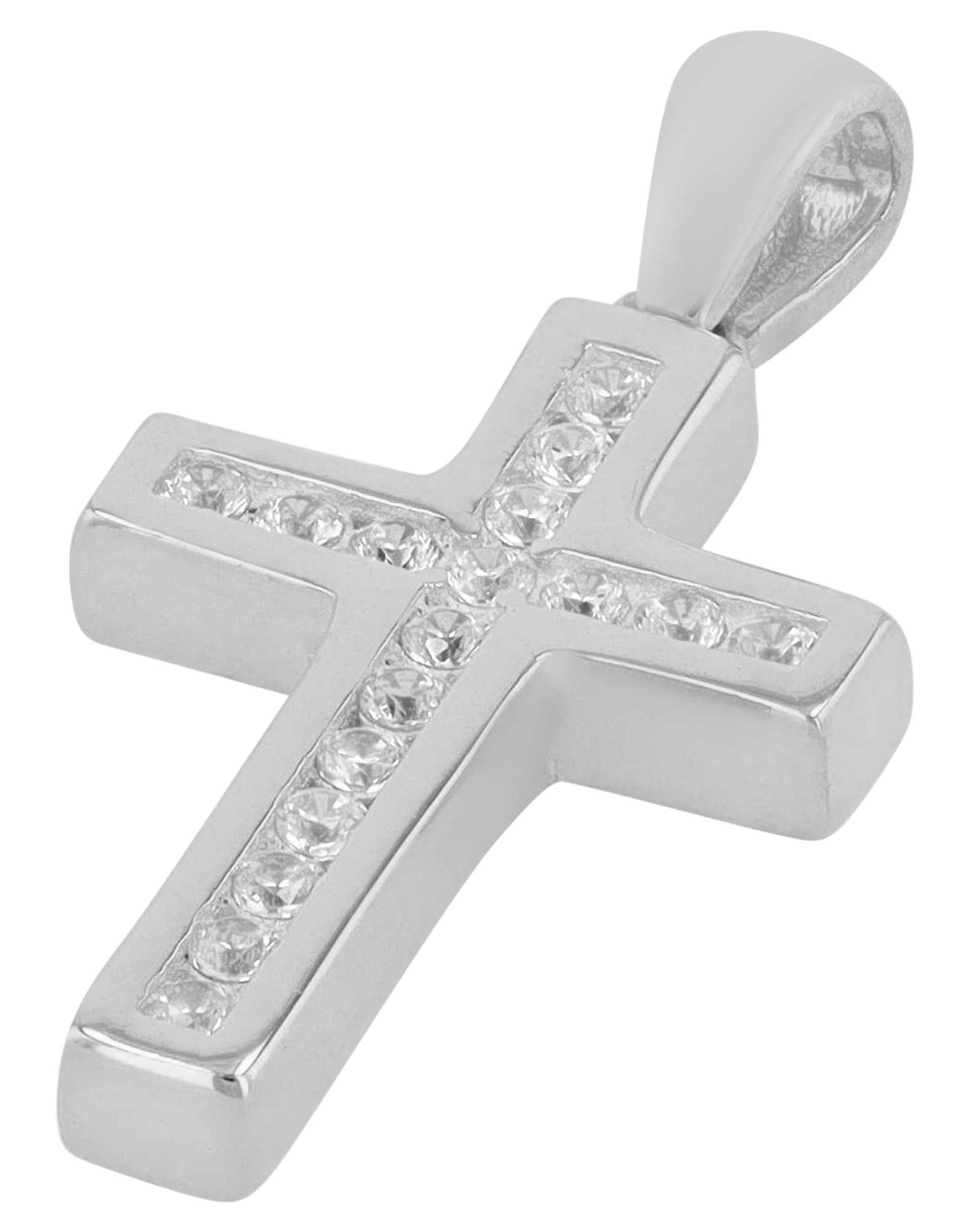 Gefertigt aus 925er Echt Silber, ist dieses Kreuz mit funkelnden weißen Zirkonen verziert. Die Maße des Anhängers betragen 22 x 13 x 2,5 mm (Gesamtlänge 2,7 cm, einschließlich der praktischen Öse).