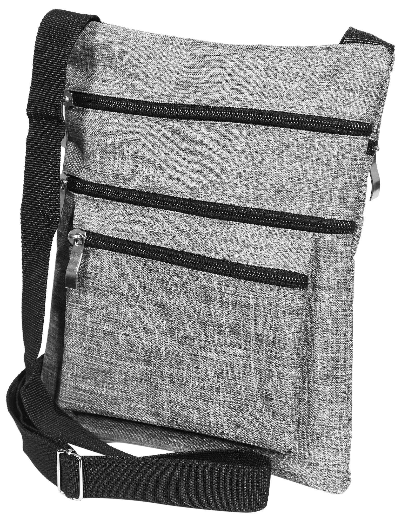 Die graue Handtasche ist aus Textil gefertigt und ist dadurch sehr belastbar und stabil. Die Vorderseite ist mit zwei großen Reißverschlussfächern und einem kleineren Fach ausgestattet. Zusätzlich verfügt die Handtasche über ein weiteres Fach auf der Rückseite, welches ebenfalls mit einem Reißverschluss ausgestattet ist. Die Tasche ist ideal um alle wichtigen Gegenstände zu verstauen, ob auf Reisen oder im Alltag - sie ist ein toller Gefährte und ein modischer Begleiter. Desweiteren verfügt die Tasche über einen Umhängegurt, welcher von der Länge individuell einstellbar ist. Sie hat eine Länge von 24 cm, eine Breite von 20 cm und eine Materialstärke im ungefüllten Zustand von 1,0 cm. Somit hat sie eine optimale Größe für jede Gelegenheit.