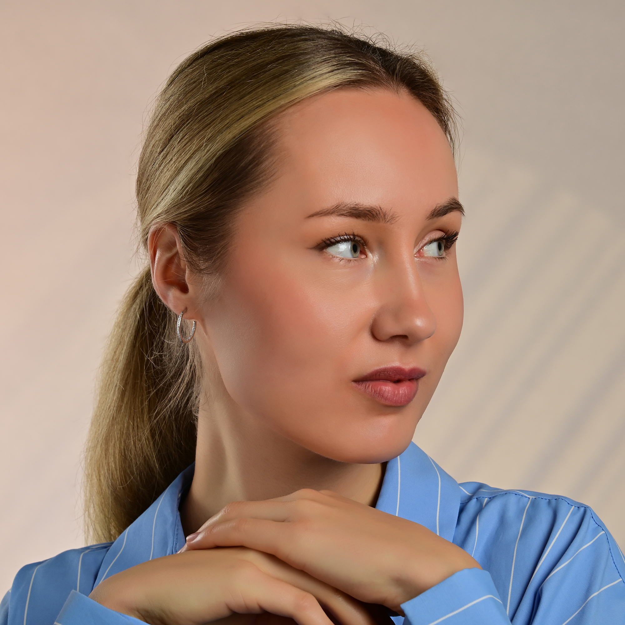 Der wahre Blickfang sind die insgesamt 25 funkelnden Zirkoniasteine, die im äußeren und im inneren Bereich der Creole angeordnet sind. 13 dieser Zirkone sind auf der Vorderseite dicht aneinandergereiht und sorgen für strahlenden Glanz. Auf der Innenseite, im hinteren Bereich der Creole wurden weitere 12 Zirkonia-Steine platziert, die "Uzma" den Anschein geben, als wäre sie komplett mit funkelnden Steinen besetzt – ein Detail, das für besondere Raffinesse sorgt.