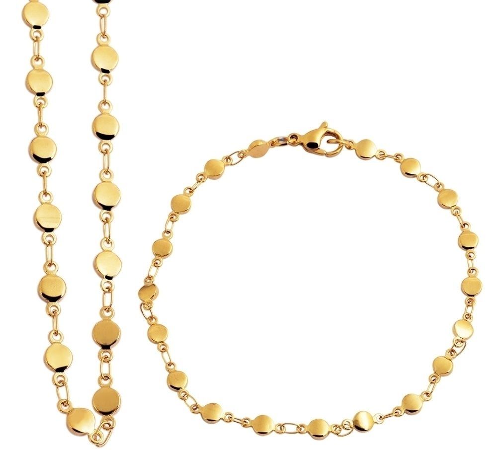 Das Schmuckset der Marke Akzent besteht aus einer Kette und einem Armband. Sowohl die Kette, als auch das Armband setzen sich aus unzähligen Edelstahlplättchen mit einem Ø von 6 mm zusammen. Diese sind über feine Edelstahlösen miteinander verbunden. Öffnen und schließen lassen sich beide Schmuckstücke des Sets mit einem stabilen Edelstahlkarabiner.