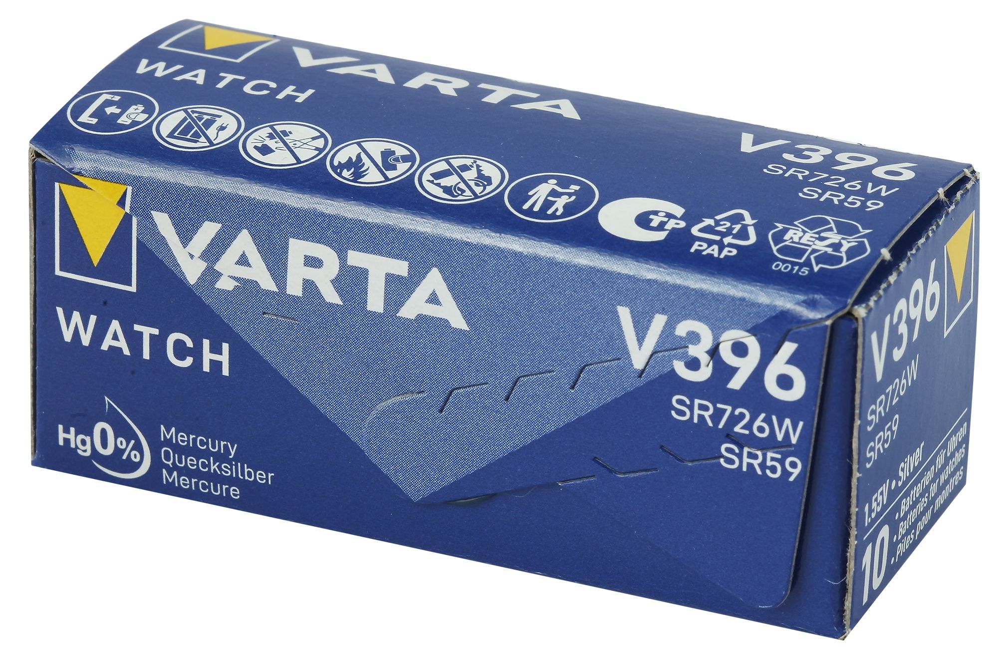Marke: Varta Typ: Knopfzellen Batterie Material: Silberoxid Spannung: 1,55 V SR 726 W Anwendungen: Uhren, Taschenrechnern, Spielzeugen, Fernbedienungen oder Taschenlampen Verpackungsinhalt: 10 StückEntsorgungshinweis.pdf