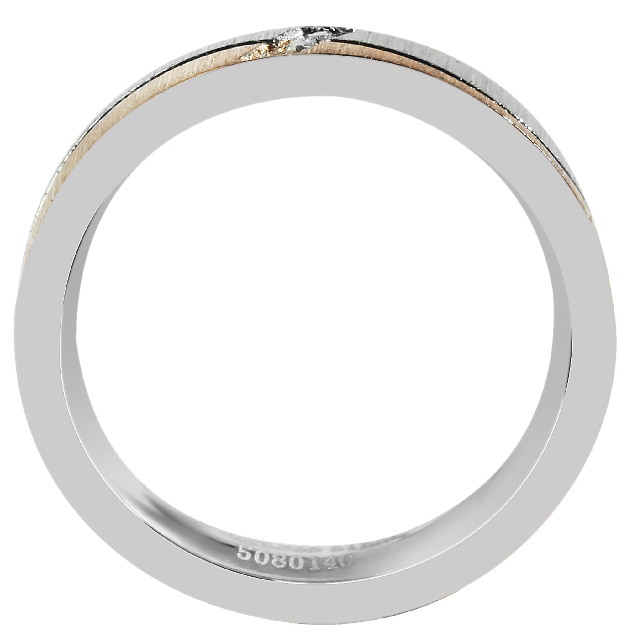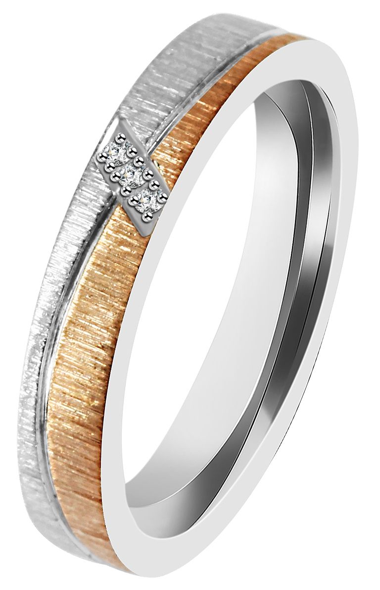 Der Damen-Partnerring zeichnet sich durch seine ansprechende Breite von 4 mm aus. Ein besonderes Highlight ist der elegante Akzent mit funkelndem Similistein-Besatz, der dem Ring eine strahlende und feminine Note verleiht. Die Bicolor-Optik, bei der silberfarbener Edelstahl auf roségoldfarbene Akzente trifft, macht diesen Ring zu einem außergewöhnlichen Schmuckstück. Der Damenring ist in den Größen 52 bis 62 erhältlich,