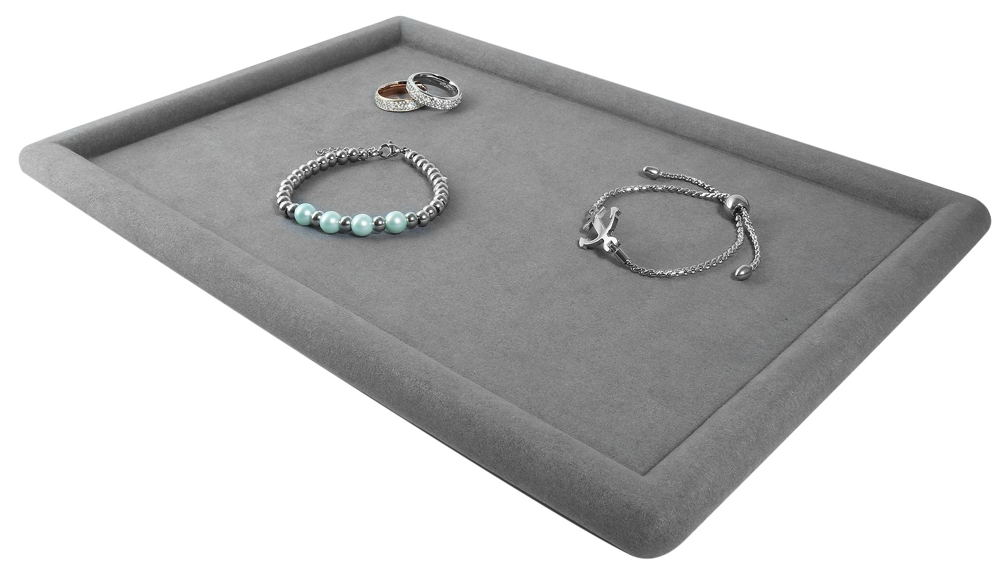 Mit großzügigen Maßen von 32,5 x 22 x 1,5 cm bietet dieses Tablett die ideale Grundlage für eine stilvolle Präsentation von Schmuckstücken. Die samtbezogene Oberfläche verleiht dem Vorlagetablett nicht nur eine elegante Optik, sondern sorgt auch dafür, dass Ihre Schmuckstücke in einer ansprechenden und geschützten Umgebung präsentiert werden. Nutzen Sie dieses Tablett, um Ihren Schmuck in Szene zu setzen und Ihren Kunden eine ansprechende Möglichkeit zu bieten, Ihre Kollektion zu entdecken.