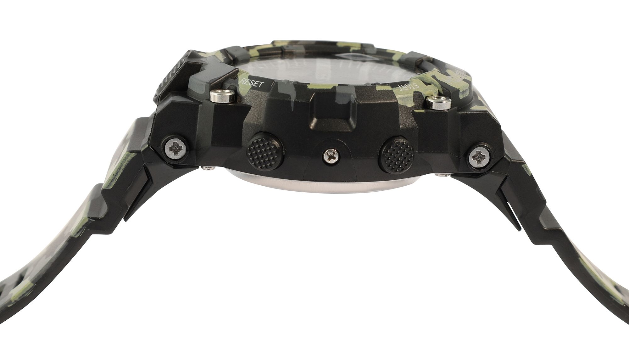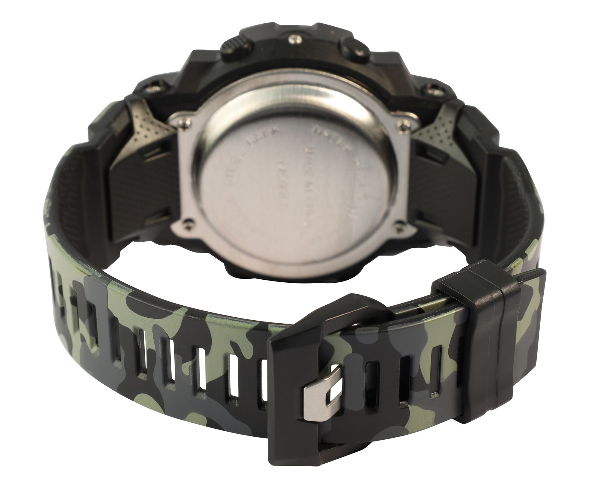 Xinjia Digitaluhr mit vielen Funktionen für den Mann. Das Armband besteht aus TPU-Material, das die Flexibilität von Silikon mit der Haltbarkeit von Kunststoff kombiniert und in einer modernen Camouflage-Optik gestaltet ist. Das Band hat eine Breite von 28 mm am Stoß und wird mit einer Dornschließe sicher verschlossen. Die Gesamtlänge der Uhr beträgt 27,5 cm, während das Gehäuse einen Durchmesser von 48 mm und eine Höhe von 18 mm aufweist. Das Gehäuse ist aus Kunststoff gefertigt, während der Gehäuseboden aus Edelstahl besteht, was für eine bessere Hautverträglichkeit und Langlebigkeit der Uhr sorgt.