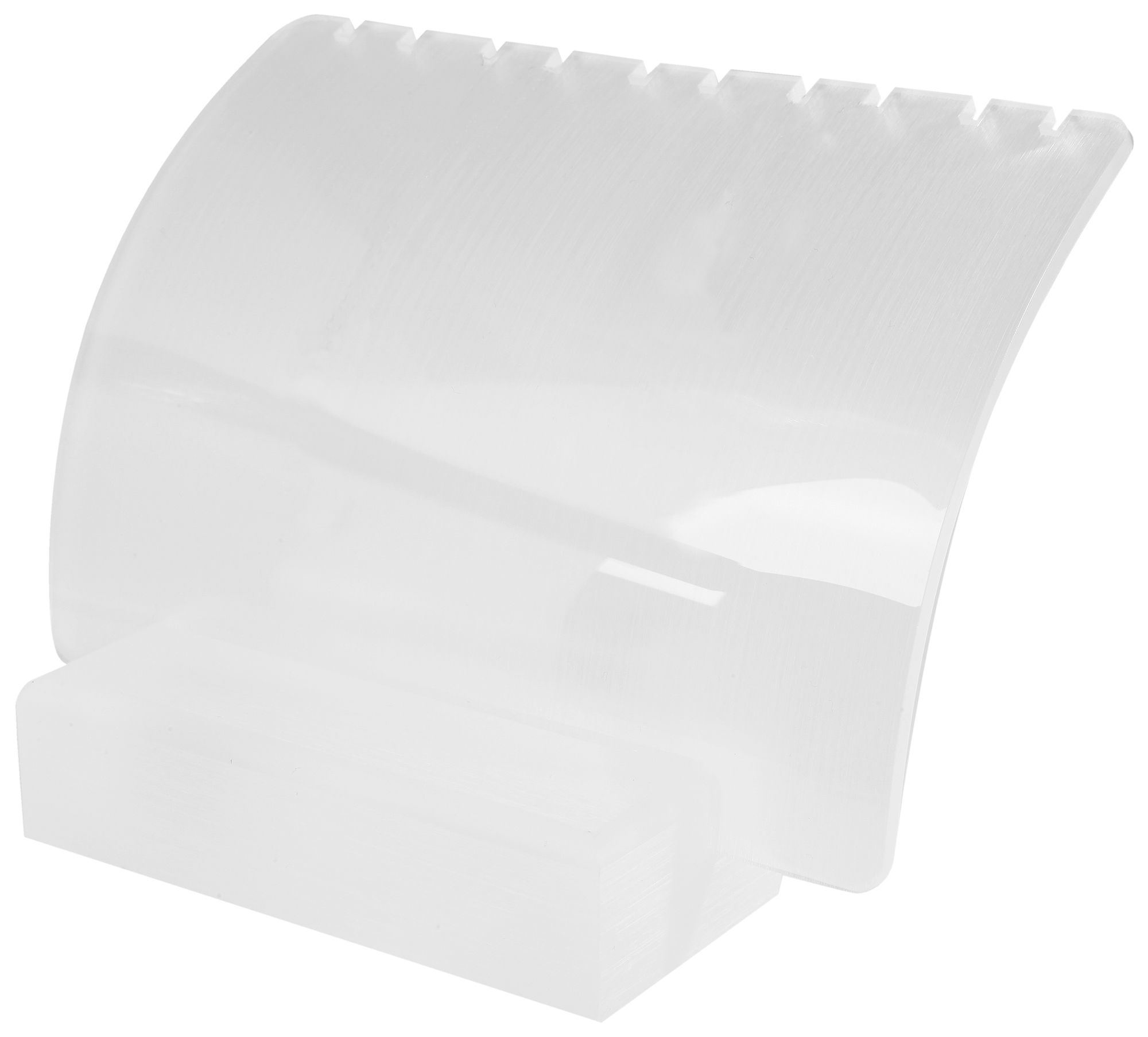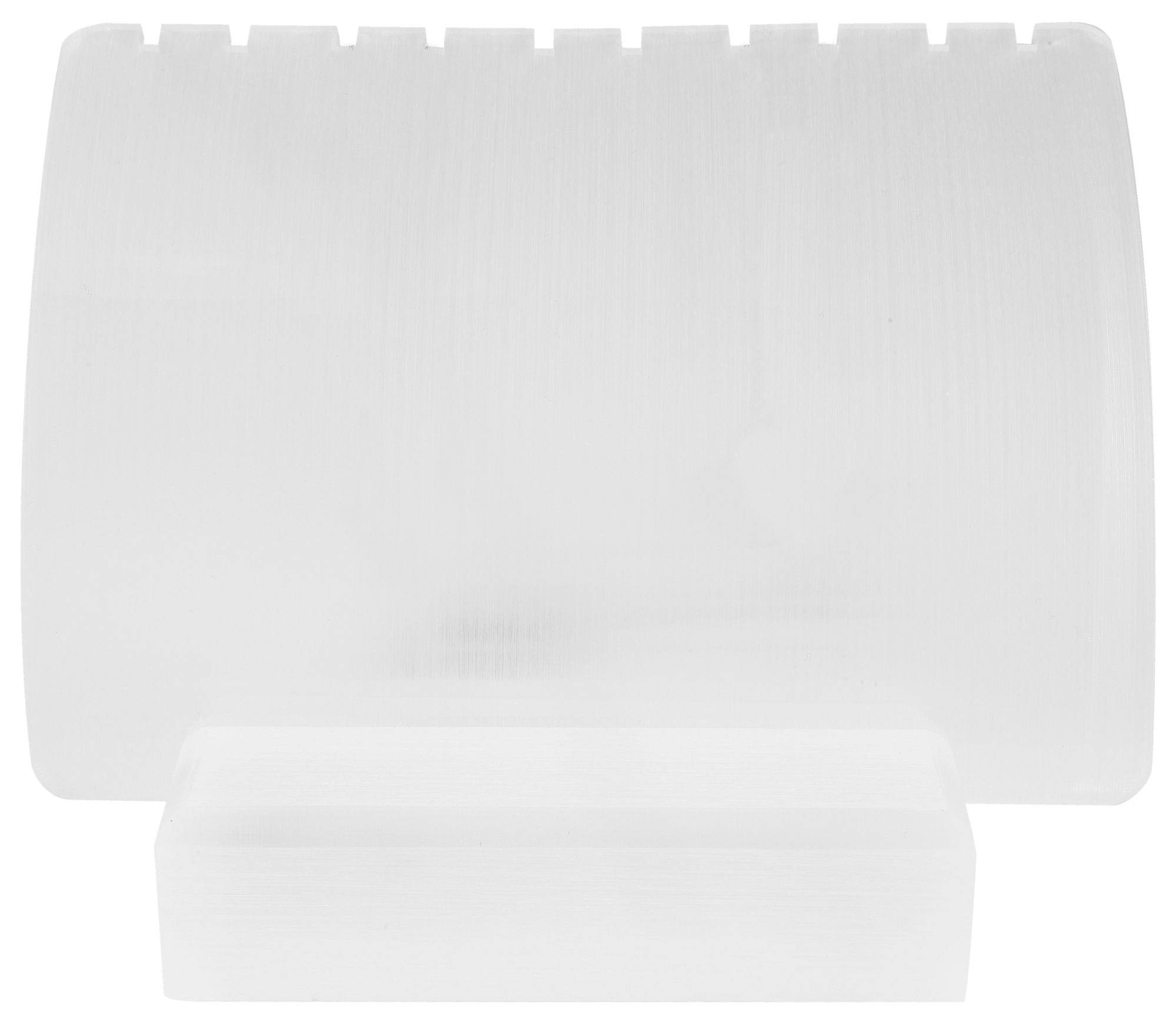 Der weiße Schmuckaufsteller ist aus Kunststoff gefertigt und perfekt zur Präsentation von Ketten, Fußketten und Armbändern geeignet. Die Präsentationsplatte lässt sich vom Standfuß trennen. Sie hat an der oberen Kante zehn Kerben in die der Schmuck eingehängt werden kann. Die Kerben haben eine Breite von ca 2,5 mm. Die dadurch entstehenden Absätze an der Oberkante haben abwechselnd eine Breite von 10 mm und 12 mm. Die Platte selbst ist leicht gewölbt und hat Abmessungen von 10 cm in der Breite und 12,5 cm in der Länge. Die Materialstärke beträgt 3 mm. Der Fuß des Schmuckständers ist 10 cm breit, 4,5 cm lang und 2,5 cm hoch. Die Kerbe für die Präsentationsplatte ist auf einer Tiefe von 15 mm eingefräst worden. Die ist 3 mm breit und 11 mm hoch. Die Hochglanzoberfläche unterstreicht den Look des Schmucks und präsentiert ihn von seiner besten Seite. Eine simple Präsentationsmöglichkeit mit der man viel erreichen kann.