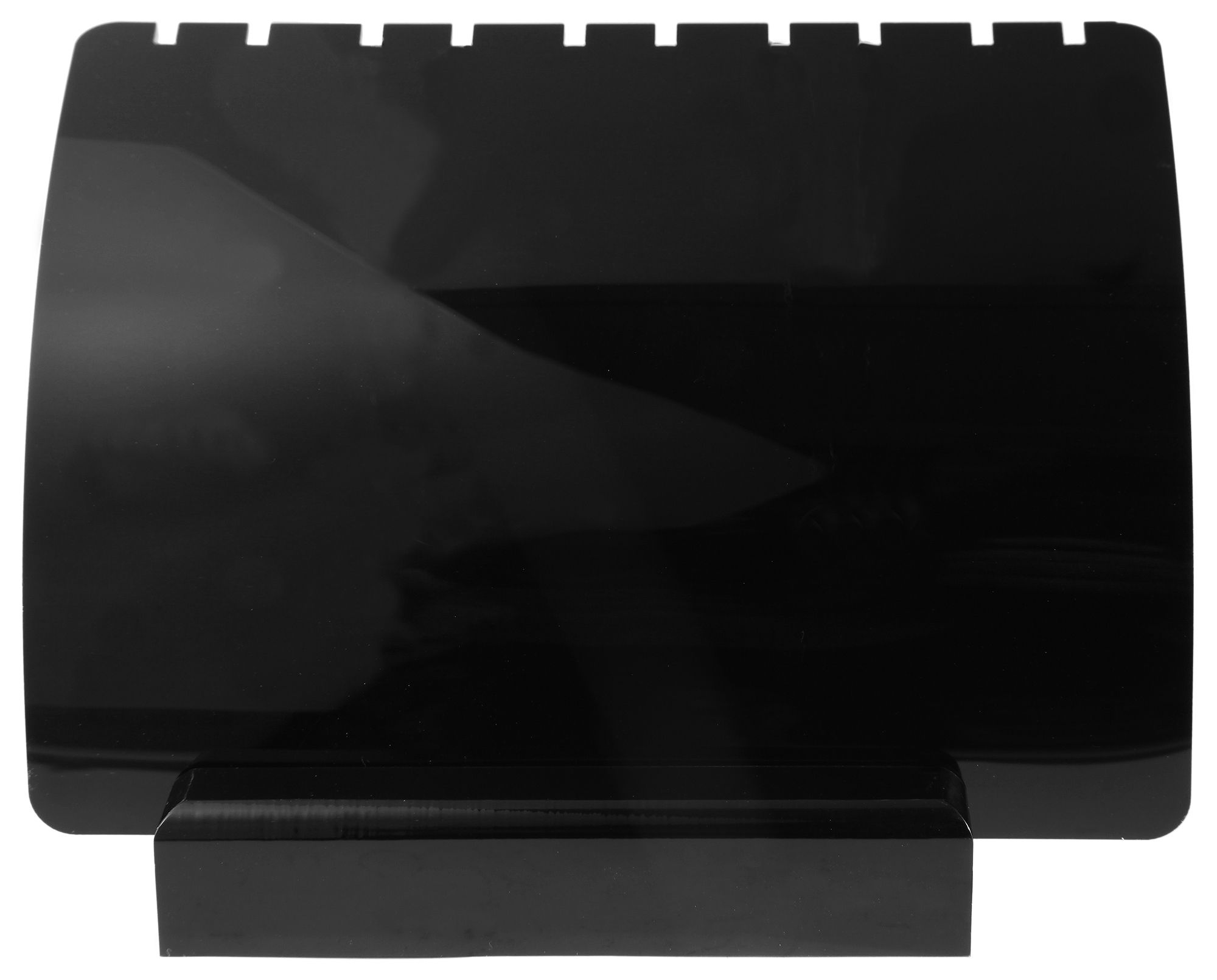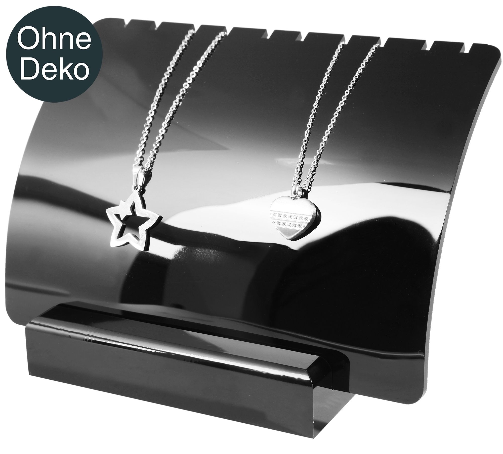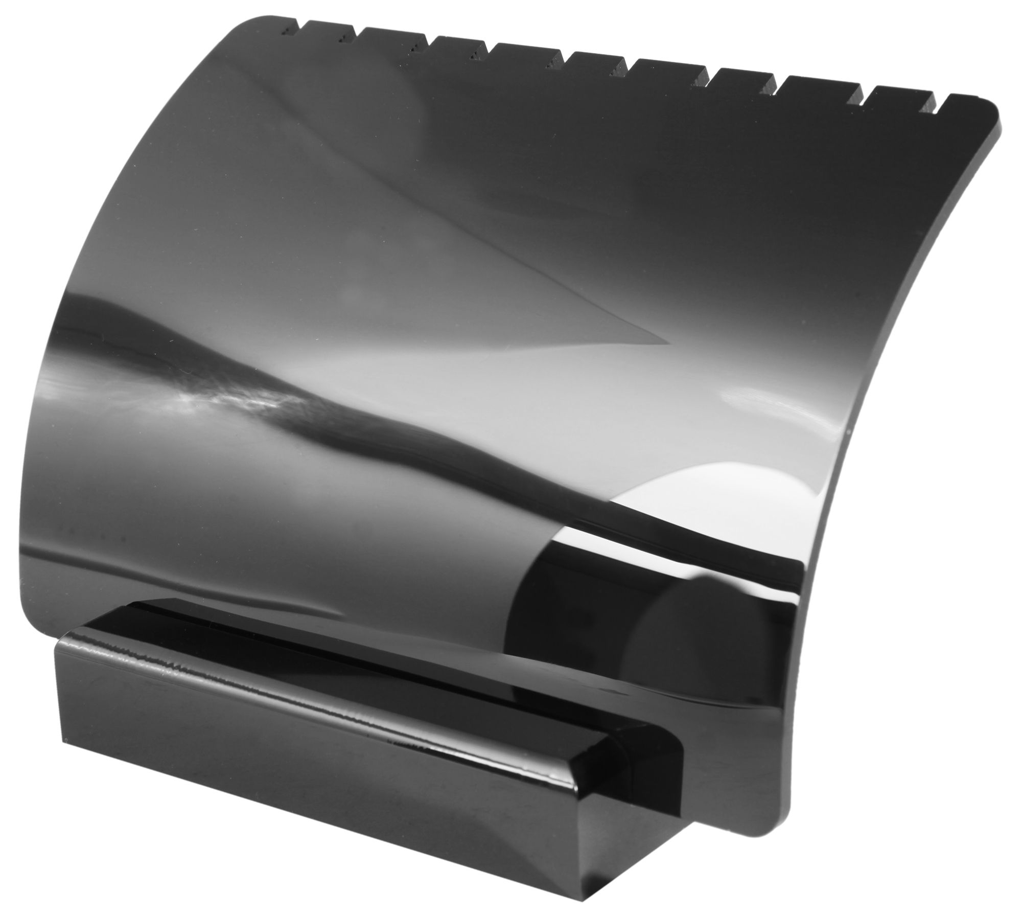 Der schwarze Schmuckaufsteller ist aus Kunststoff gefertigt und perfekt zur Präsentation von Ketten, Fußketten und Armbändern geeignet. Die Präsentationsplatte lässt sich vom Standfuß trennen. Sie hat an der oberen Kante zehn Kerben in die der Schmuck eingehängt werden kann. Die Kerben haben eine Breite von ca 2,5 mm. Die dadurch entstehenden Absätze an der Oberkante haben abwechselnd eine Breite von 10 mm und 12 mm. Die Platte selbst ist leicht gewölbt und hat Abmessungen von 10 cm in der Breite und 12,5 cm in der Länge. Die Materialstärke beträgt 3 mm. Der Fuß des Schmuckständers ist 10 cm breit, 4,5 cm lang und 2,5 cm hoch. Die Kerbe für die Präsentationsplatte ist auf einer Tiefe von 15 mm eingefräst worden. Die ist 3 mm breit und 11 mm hoch. Die Hochglanzoberfläche unterstreicht den Look des Schmucks und präsentiert ihn von seiner besten Seite. Eine simple Präsentationsmöglichkeit mit der man viel erreichen kann.