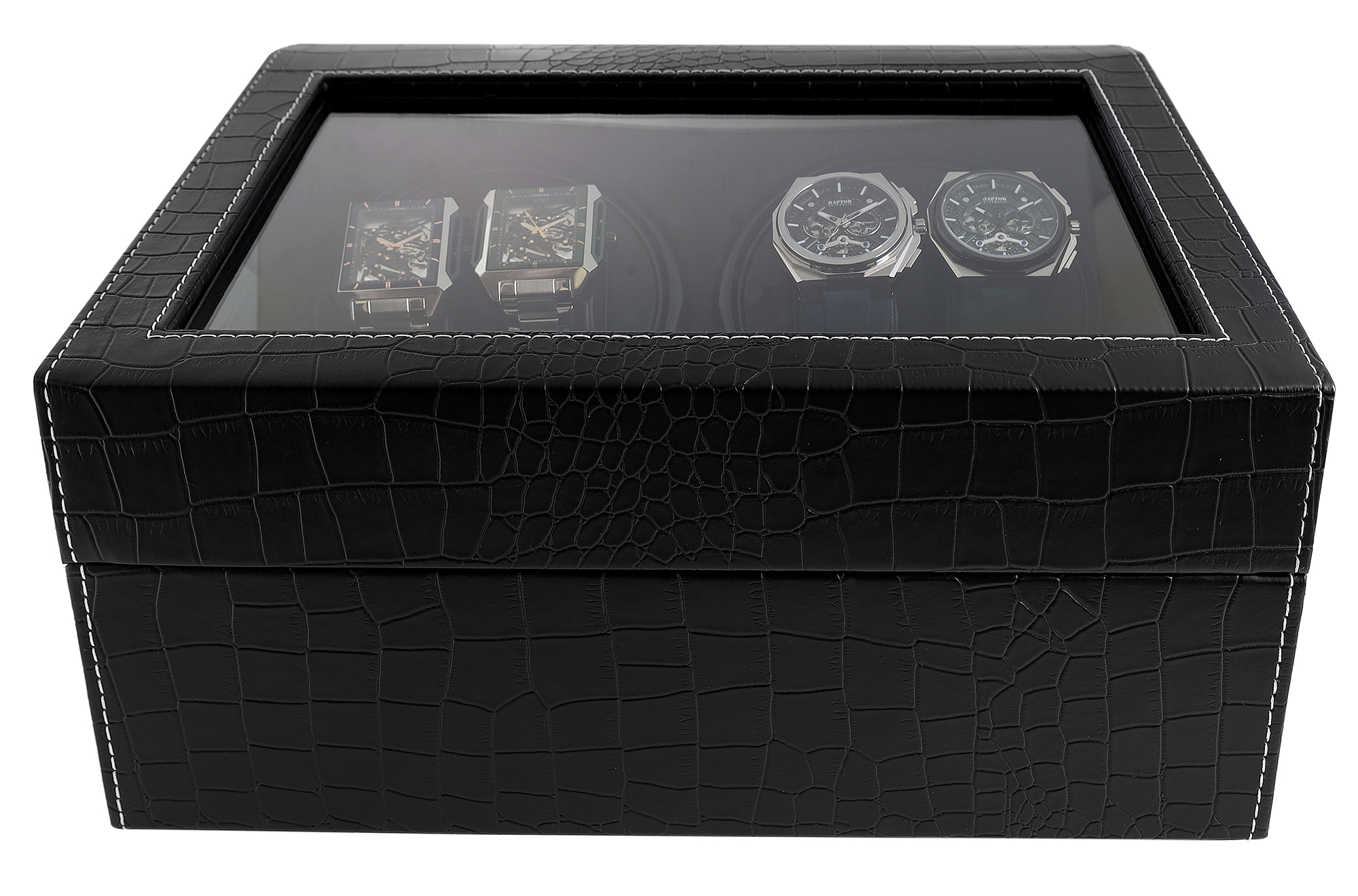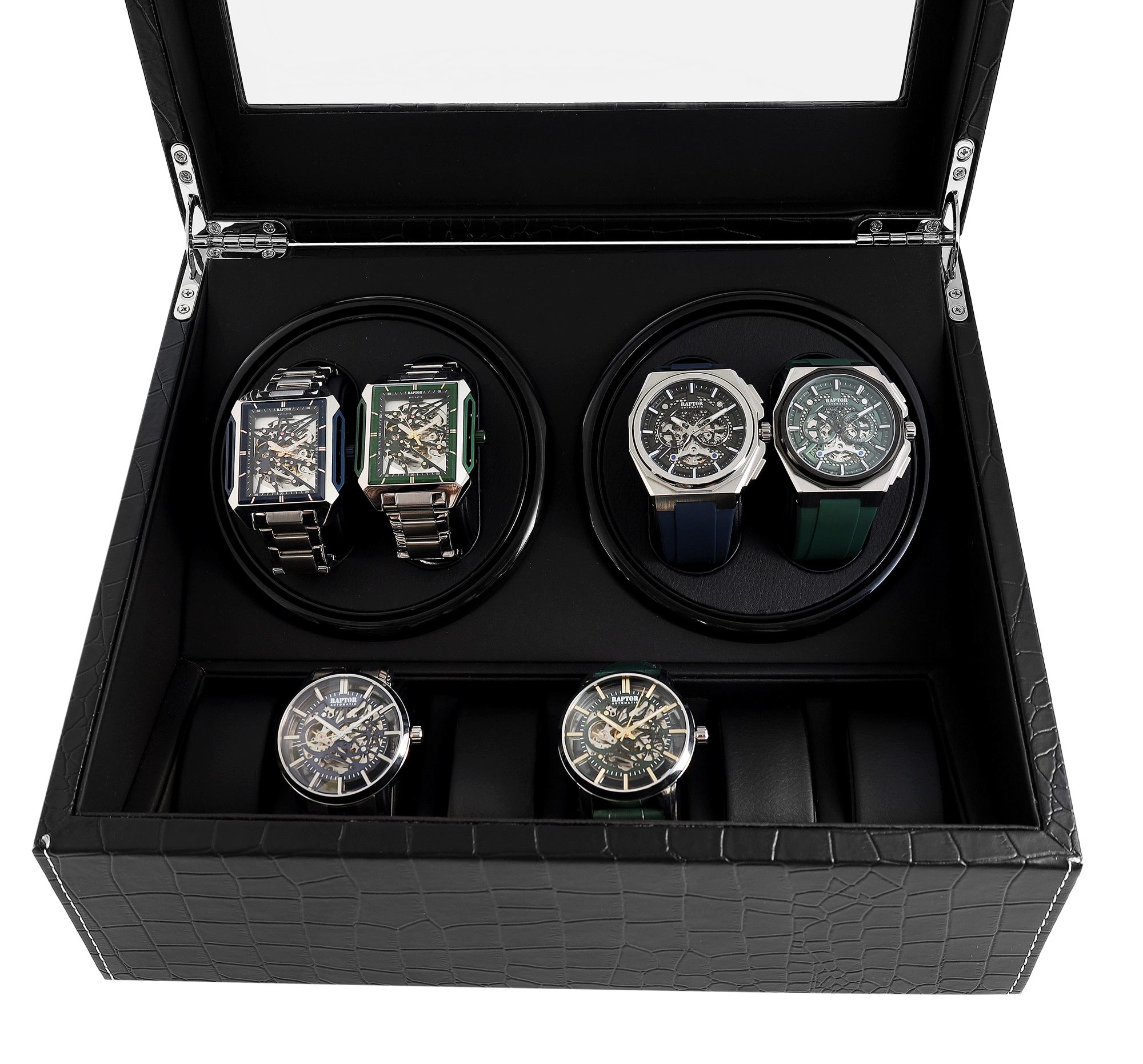 Er kombiniert professionelle Aufzugstechnik mit einer beeindruckenden Kapazität. Das Gerät bietet Platz für 4 Uhren in Bewegung auf zwei separat schaltbaren Drehmodulen sowie zusätzlichen Stauraum für 6 weitere Zeitmesser als stationäre Ablage.
